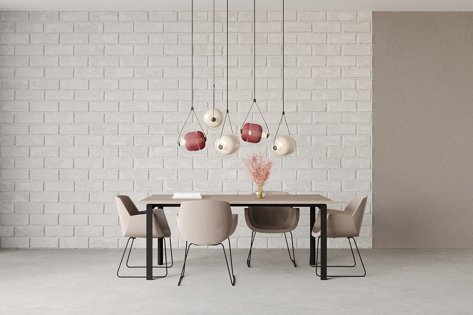 A simple metal base and visually levitating table top with overlap, in natural veneer, matt varnish or wood décor, create a dining table with a touch of industrial style.