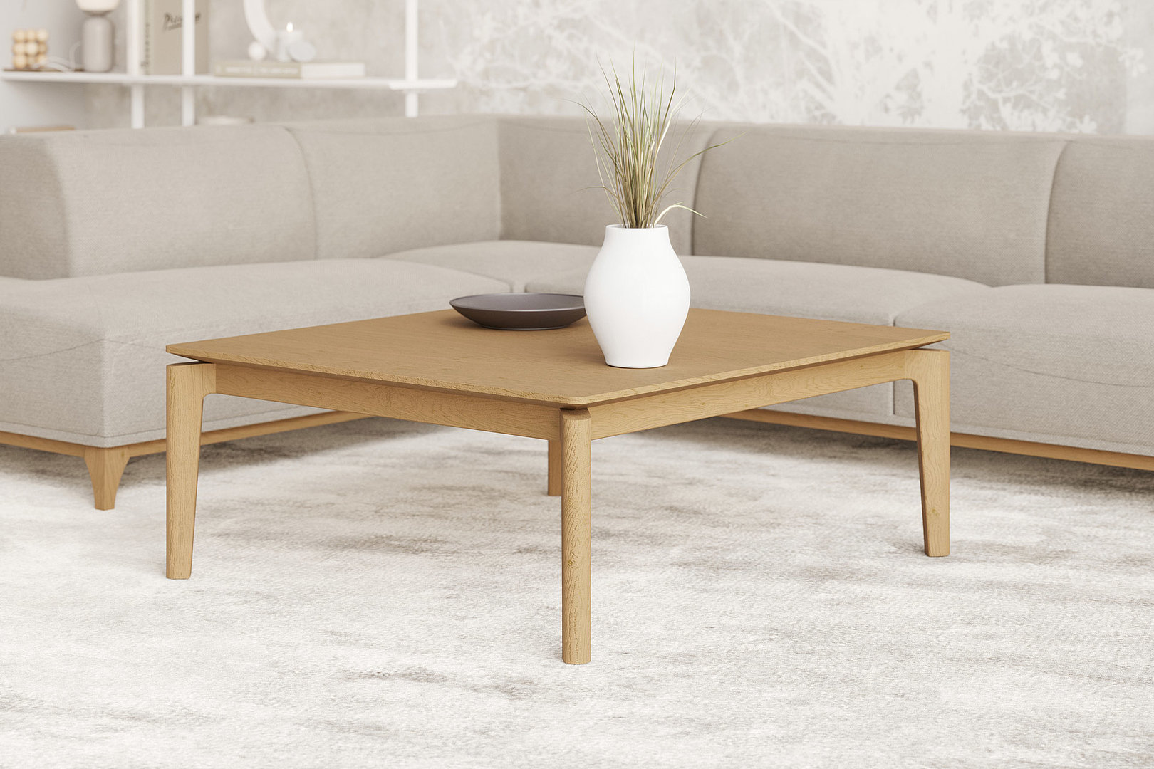 A coffee table with crafted legs and bevelled table top, which gives the product a subtle impression.