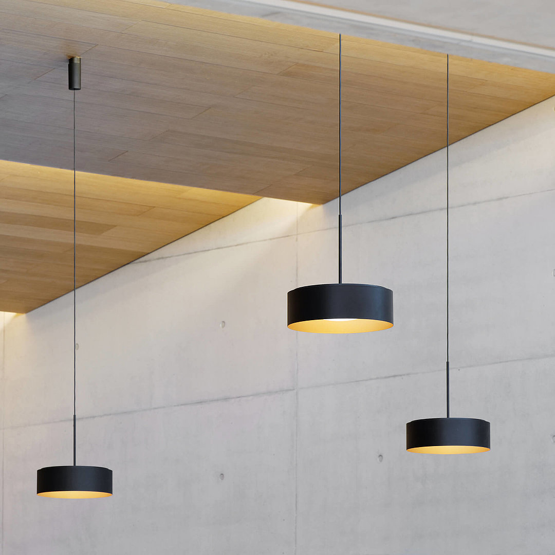 Minimalistické svítidlo ve tvaru širokého válce. Vnější plášť svítidla je v matné černé barvě nebo bílé, zatímco vnitřní plocha nabízí výběr z mědi, hliníku, mosazi a bílé barvy, rovněž v matném provedení. Celek vkusně doplňuje černý napájecí kabel.