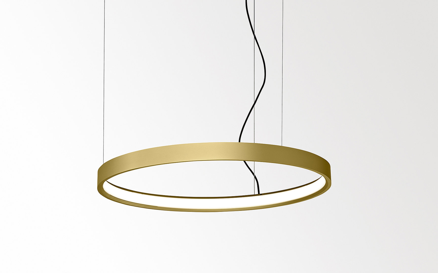 Superloop luminaires are available in 10 sizes. They shine diffusely around the inner circumference of the circle. There is a choice of white, black, bronze and gold versions of the luminaire and 2 ways of hanging.