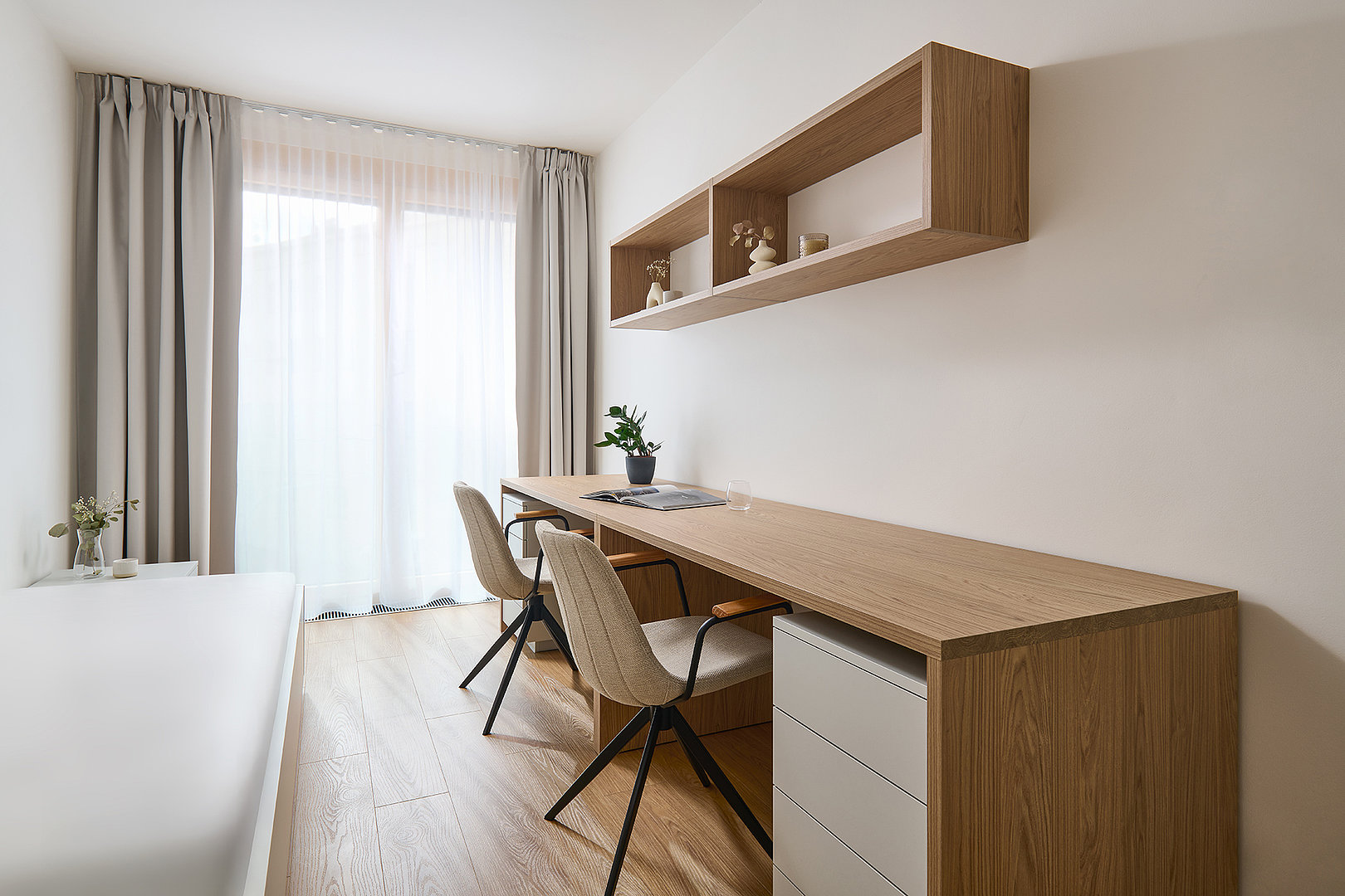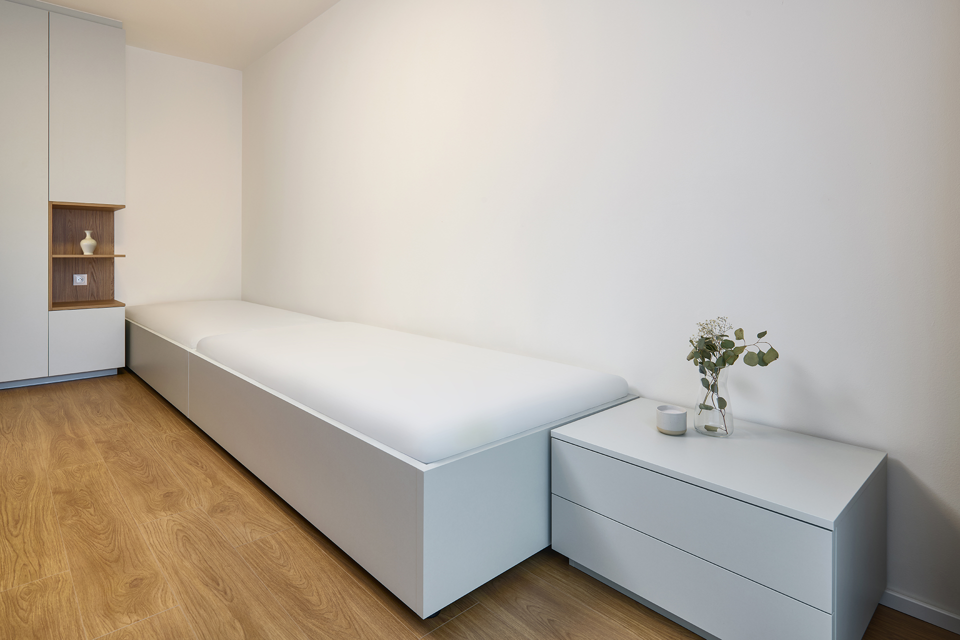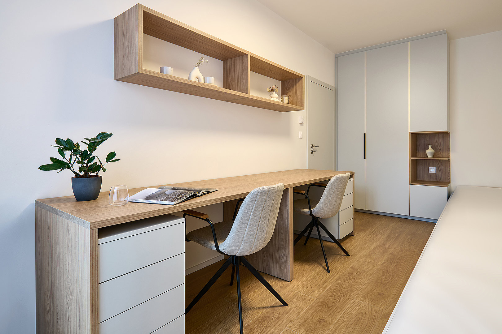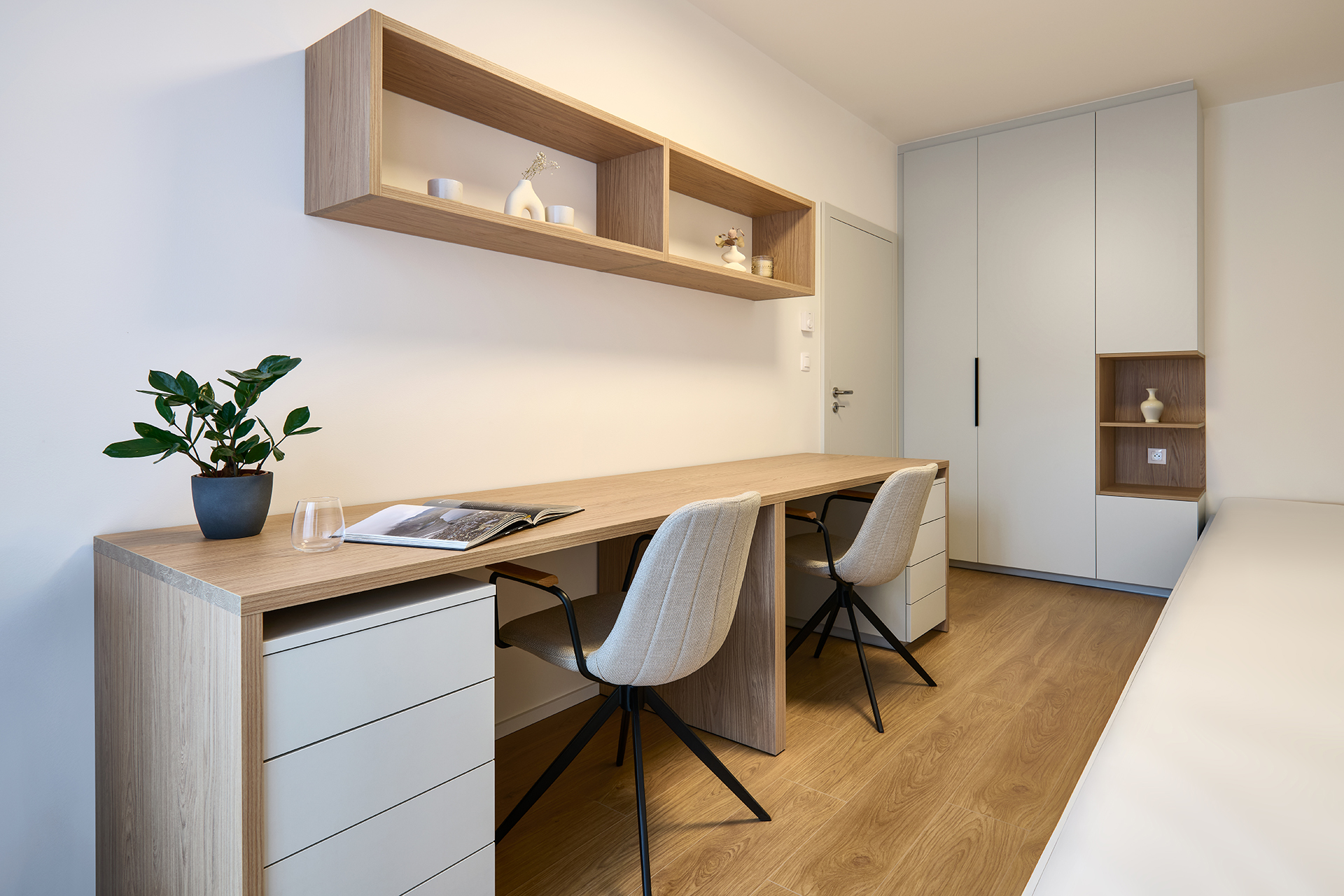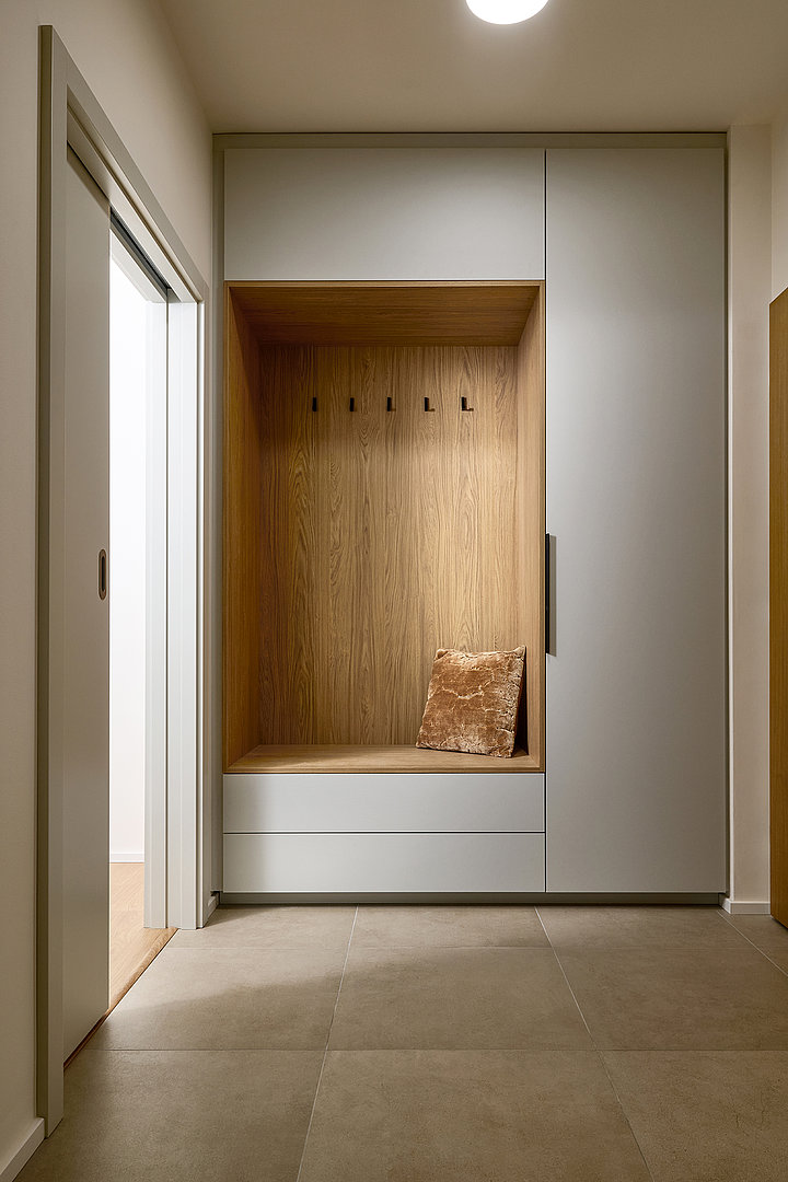 The material and colour concept flows seamlessly into the other rooms of the apartment. The bedroom and additional room feel calm and well-organised, with an emphasis on functionality, sufficient storage space and a pleasant atmosphere. Thoughtfully designed details complete the concept, supporting the long-term timelessness of the interior.
