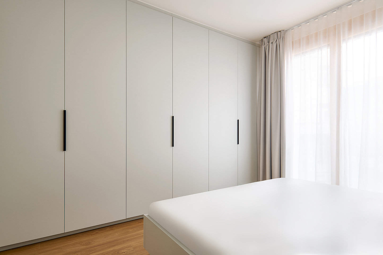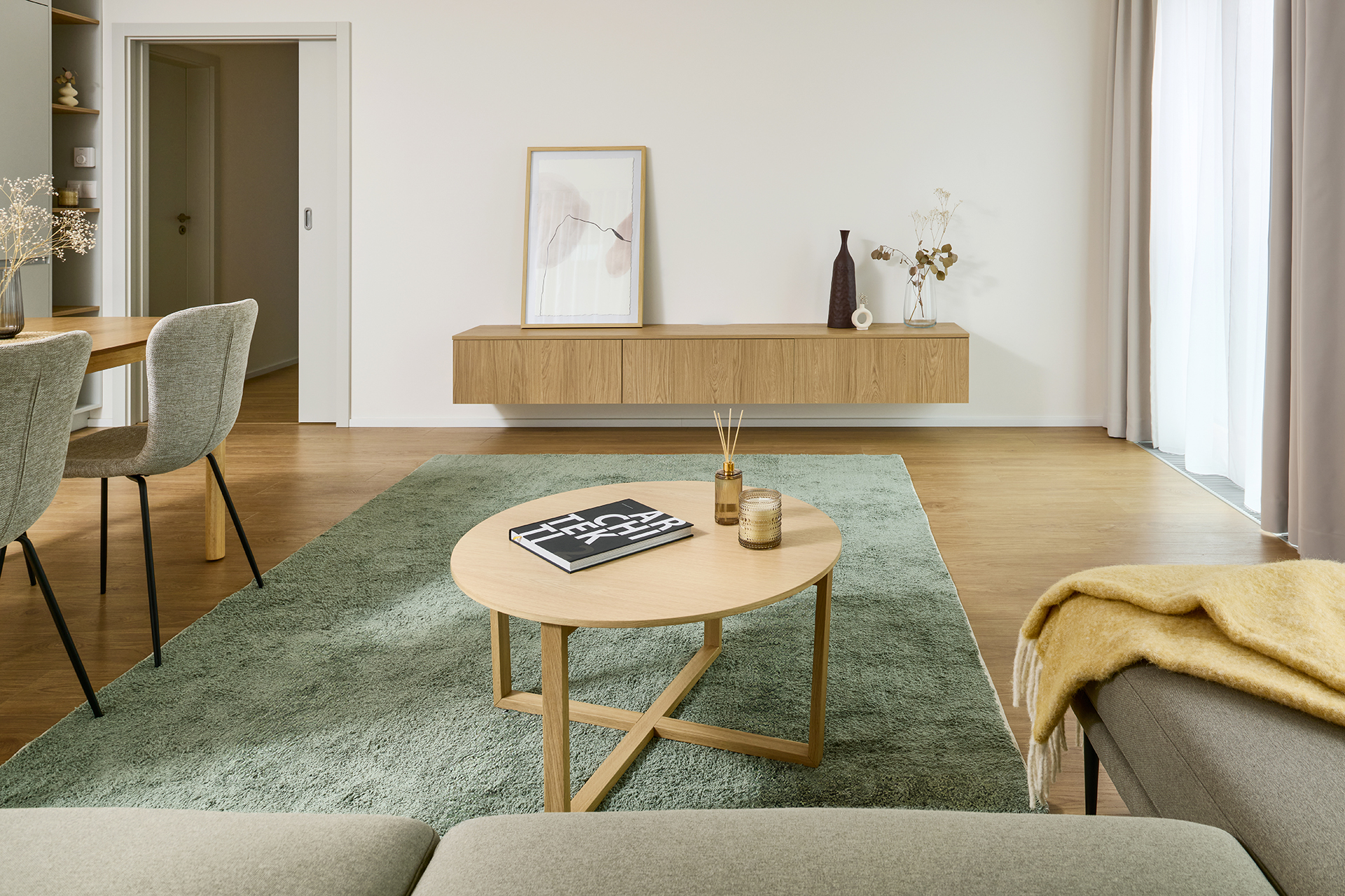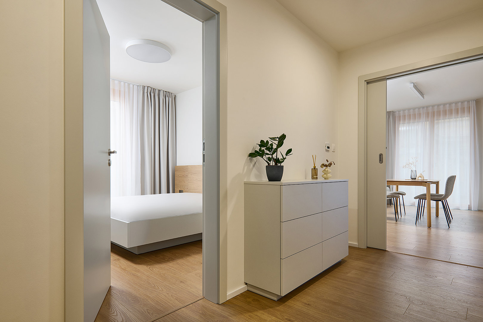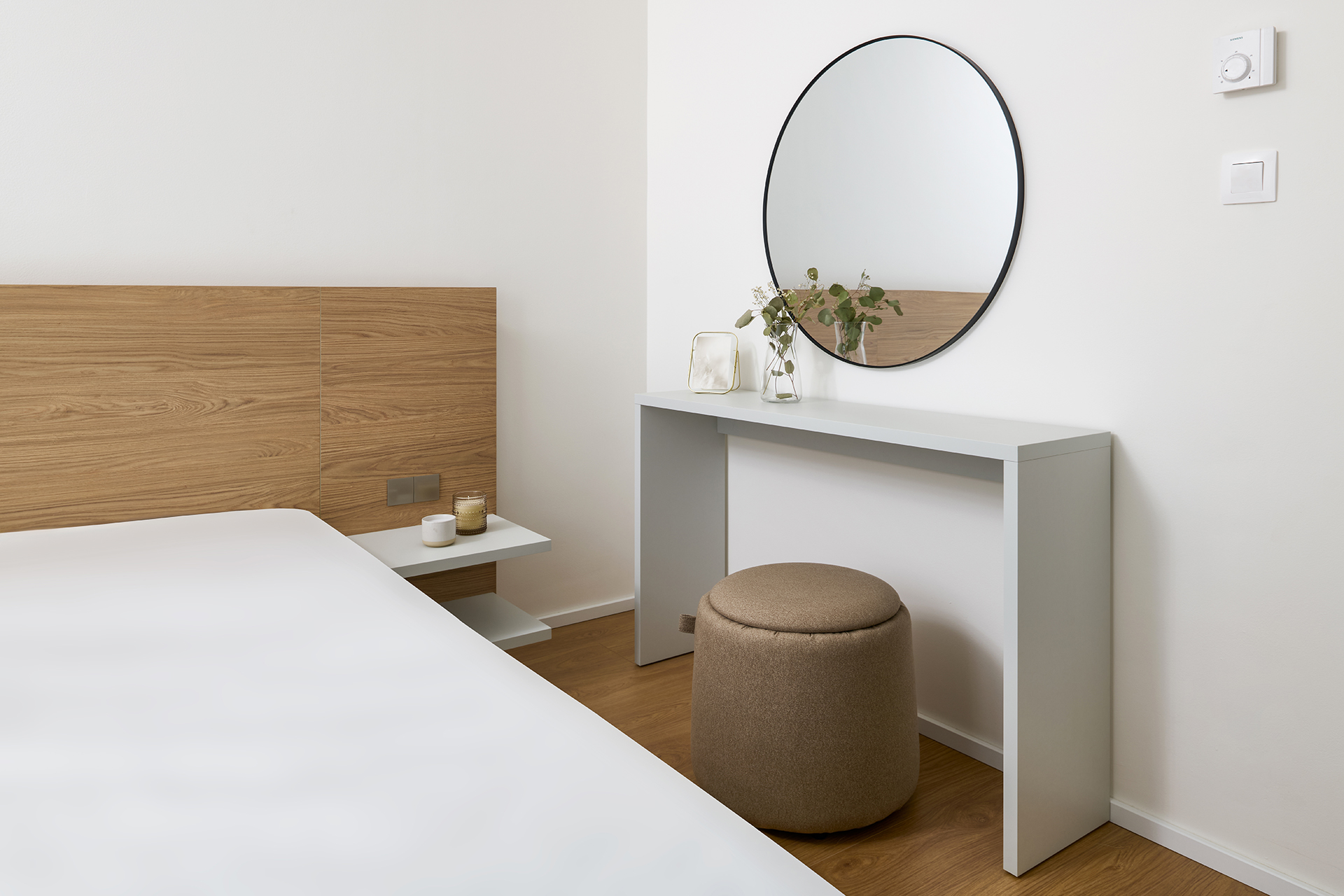 The material and colour concept flows seamlessly into the other rooms of the apartment. The bedroom and additional room feel calm and well-organised, with an emphasis on functionality, sufficient storage space and a pleasant atmosphere. Thoughtfully designed details complete the concept, supporting the long-term timelessness of the interior.