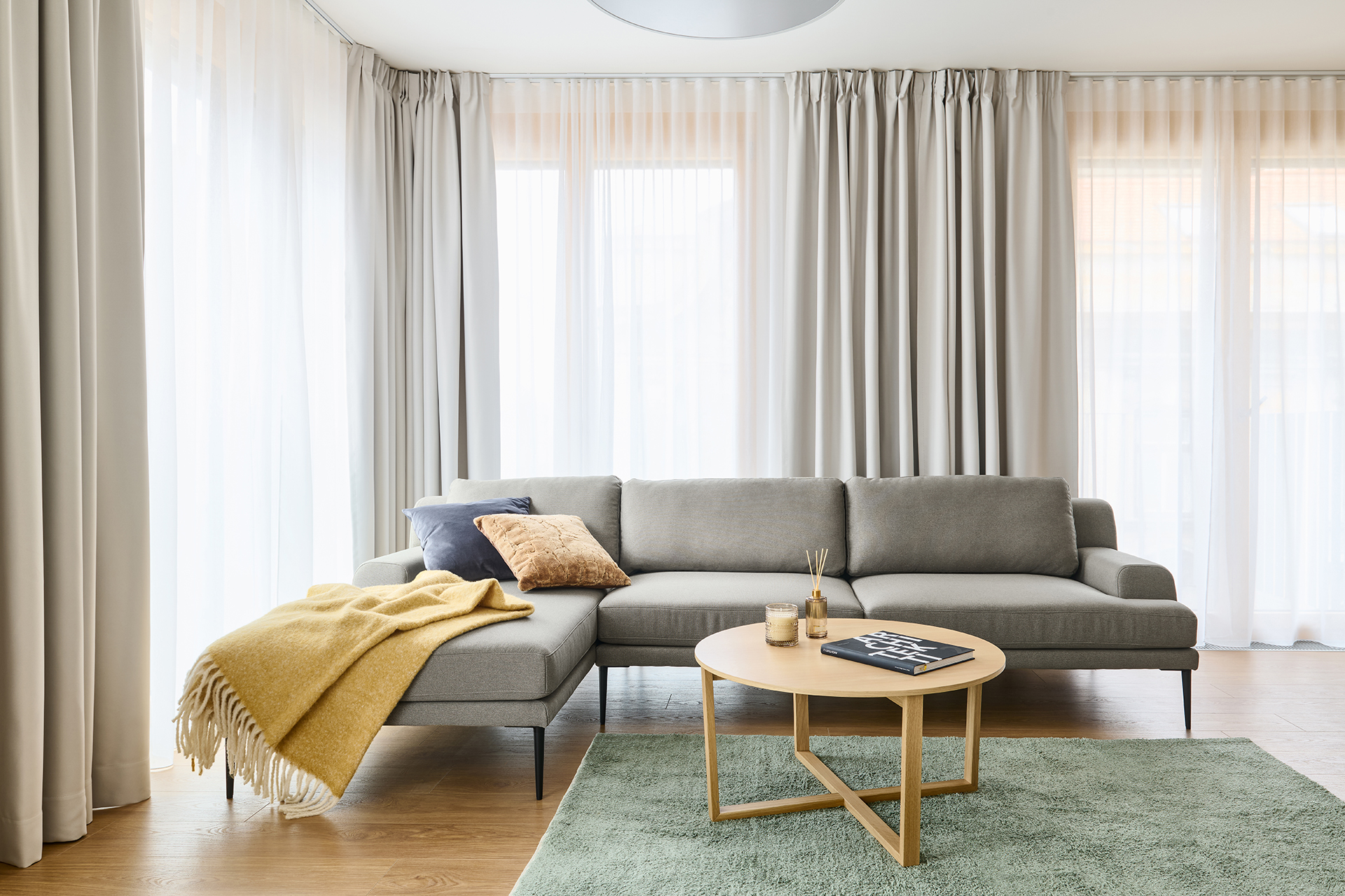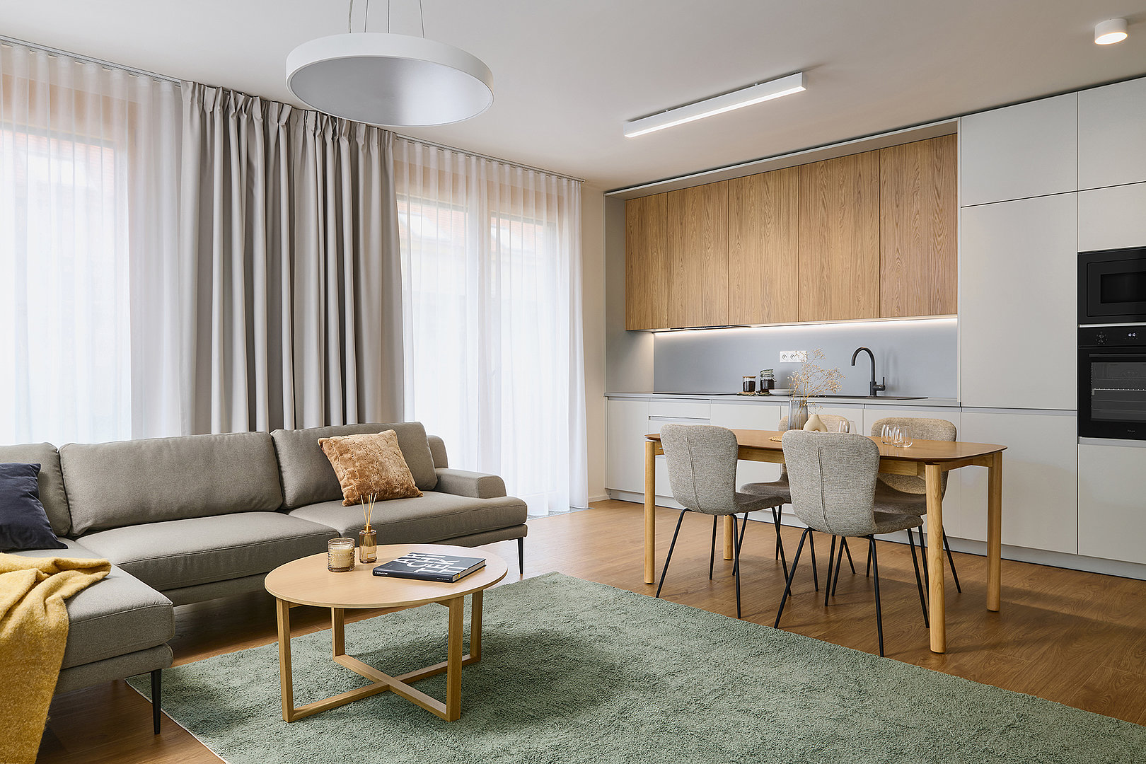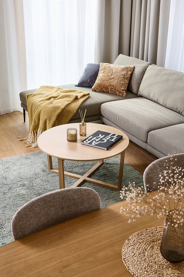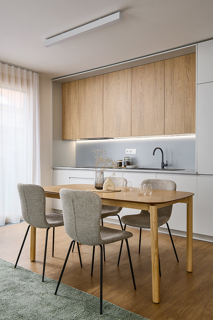 The interior of the 3-room apartment is designed as a balanced and functional whole, offering ample space for everyday life as well as a calm environment for relaxation. The core of the living area is the SIMPLE kitchen, combining grey laminate with quercus sienna oak décor, naturally connecting the kitchen area with the dining and living spaces. Unified materials and clean lines enhance the sense of openness and visual calm.