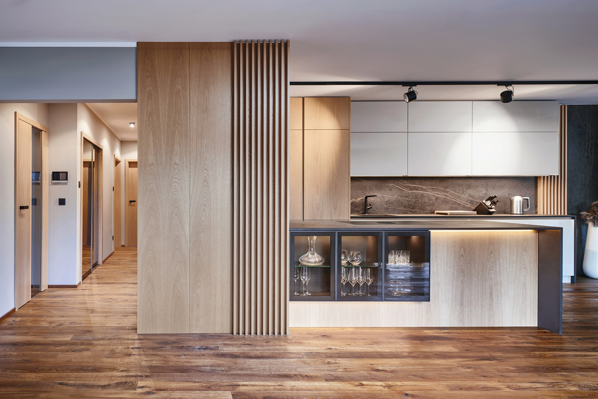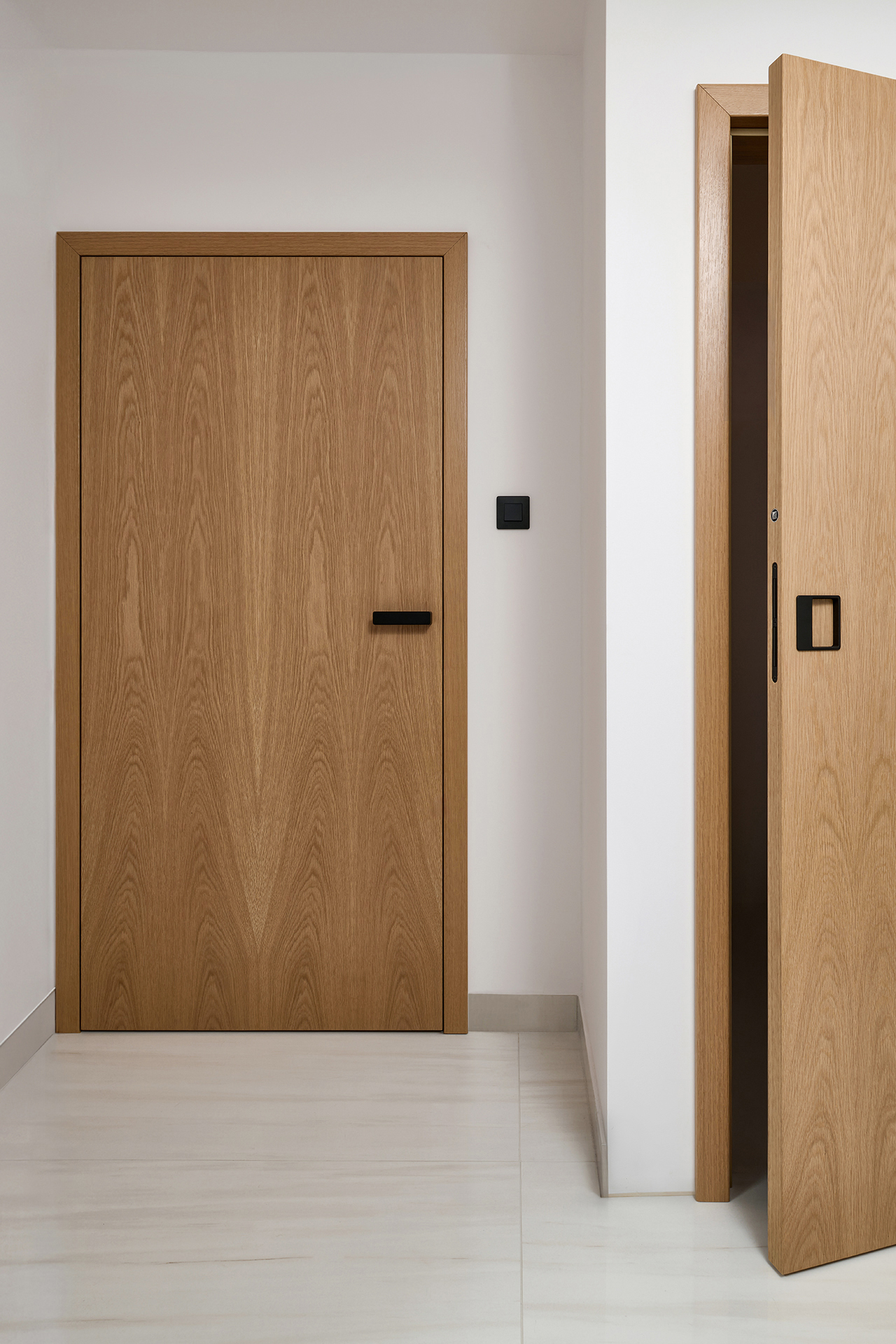 The uniform style is also reflected in the interior doors in the SPACE and SPIRIT models, which follow the same material solution. Black matt MINIMAL TIN-K fittings, JOO MAGNETIC handles, concealed hinges and magnetic locks create a minimalist but functional detail.