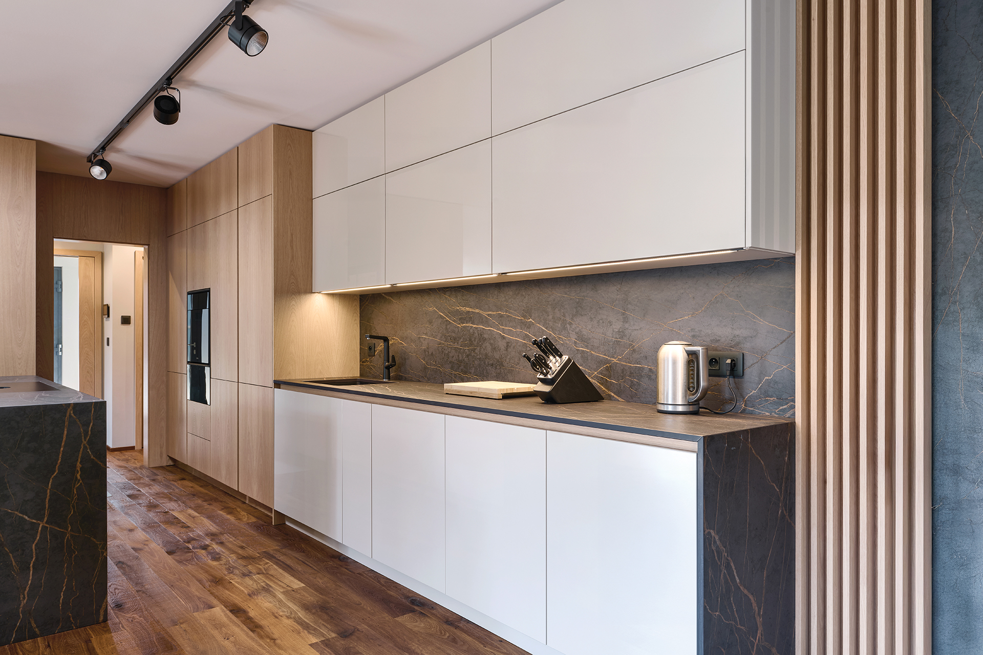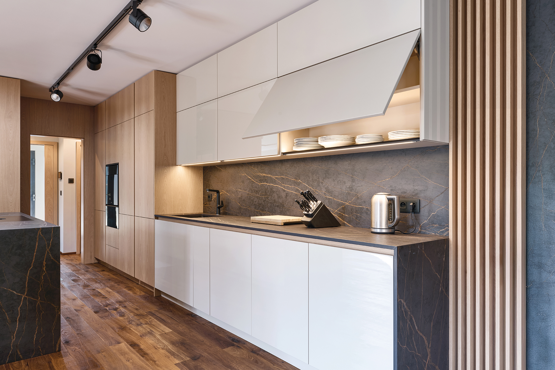 The open space is dominated by a custom-made kitchen that sensitively combines the ELITE and LINE models. The worktop and splashback made of DEKTON LAURENT with a distinctive pattern seamlessly connect to the veneered panels and combine durability with a timeless interior look. Sophisticated backlighting gently highlights the table surfaces, plinths, display cabinets, and furniture storage spaces. Technical perfection is underlined by top-of-the-range BORA appliances.