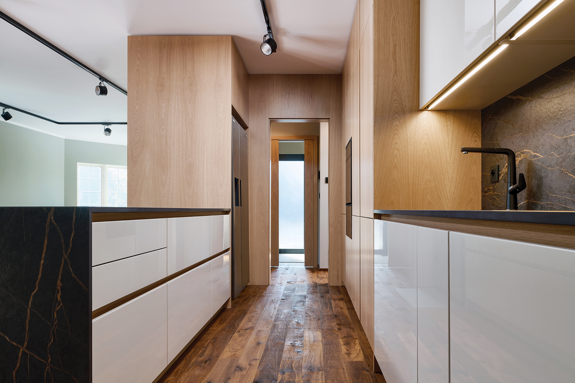 The interior of this house is based on precise craftsmanship and the clean lines of modern design. Oak veneer contrasts with shiny Champagne lacquer to create a bright and distinctive character.