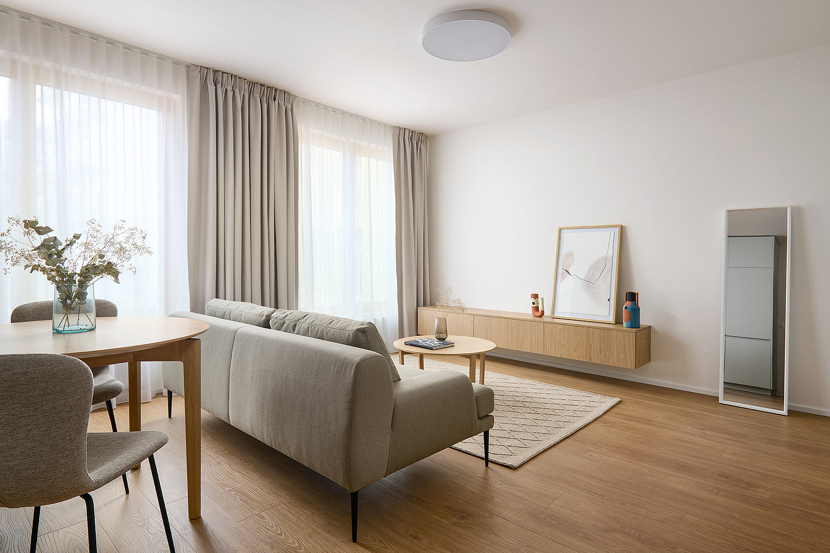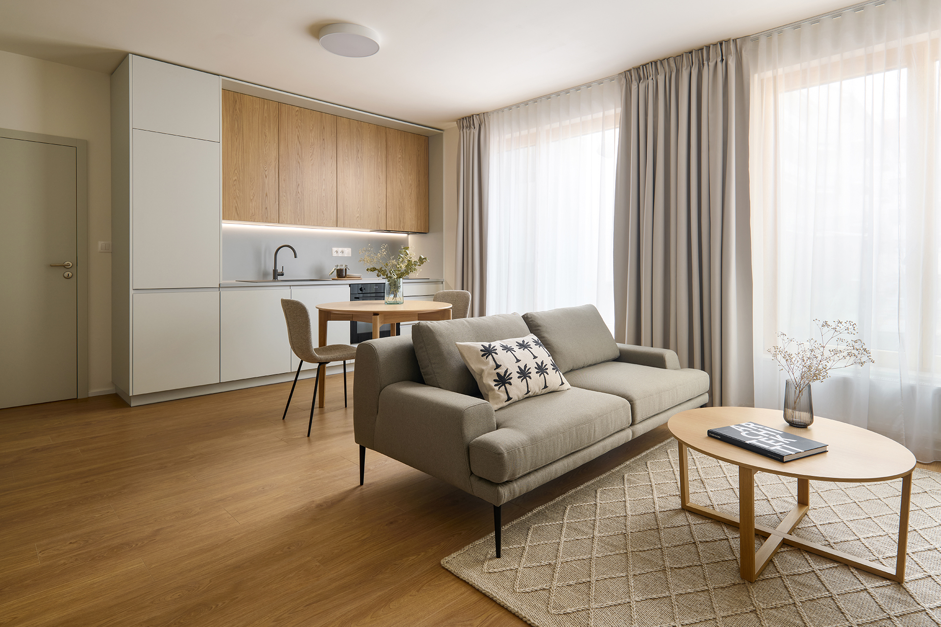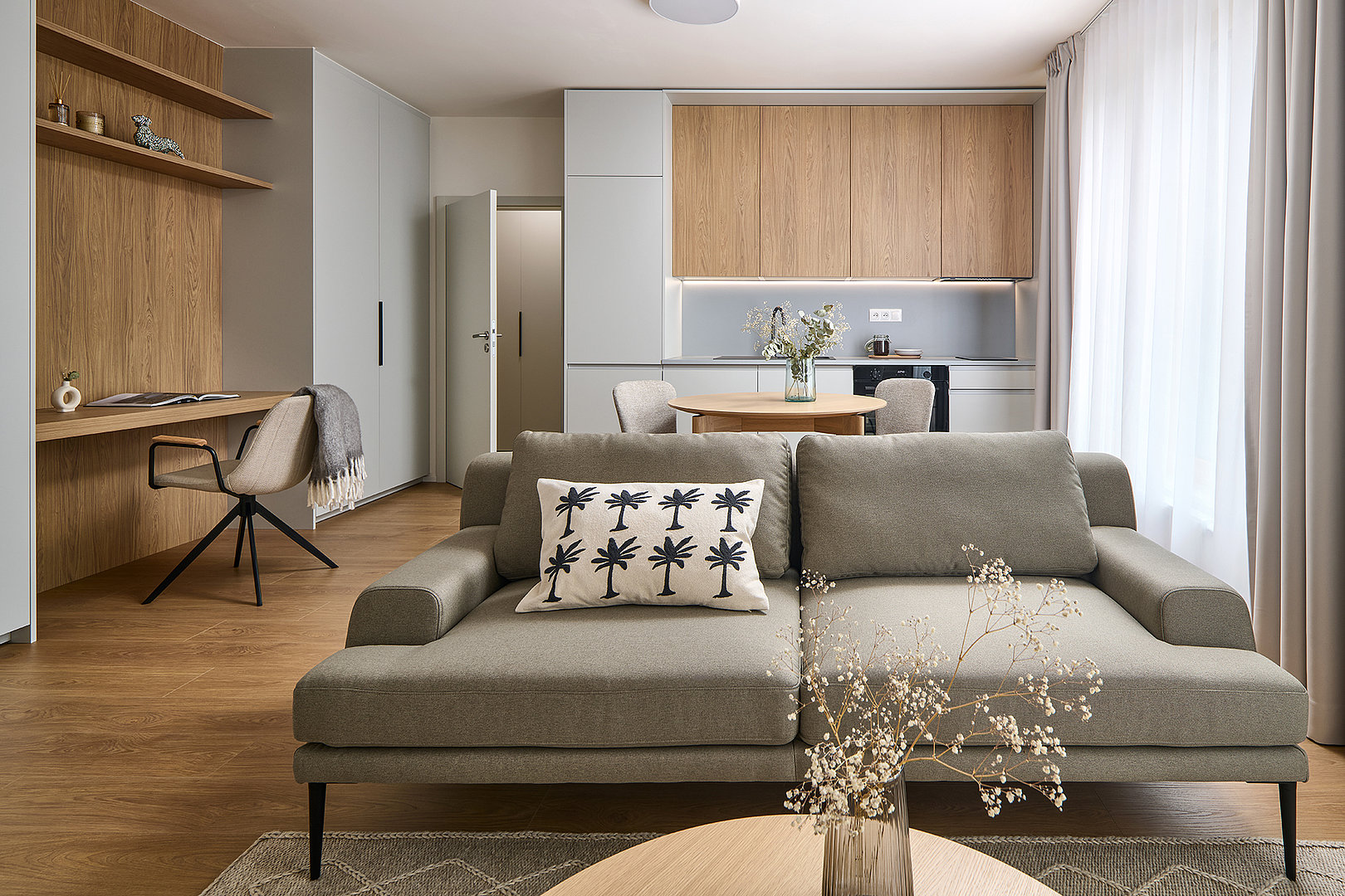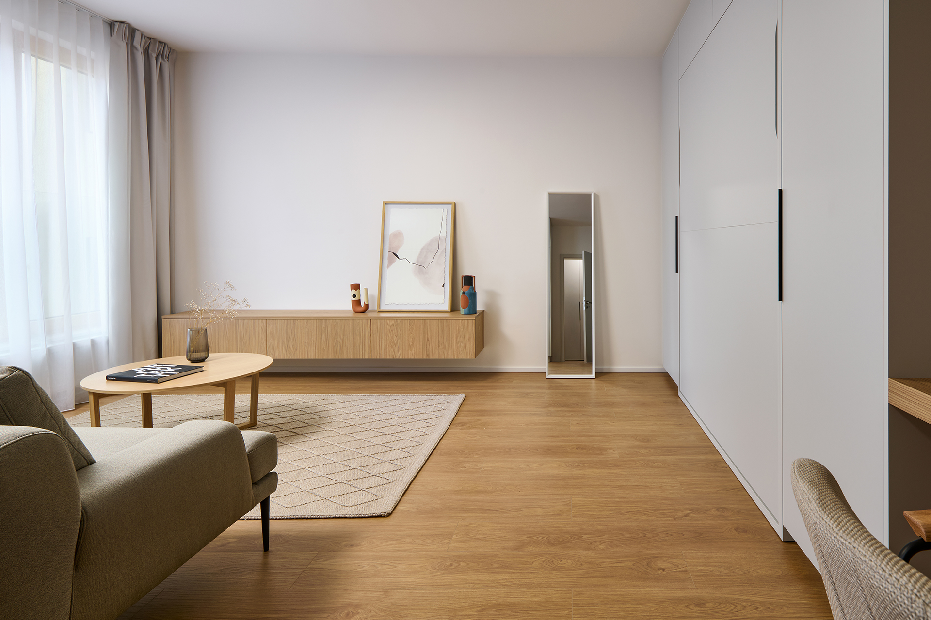 The interior of the 1-room apartment is designed as a flexible and naturally adaptable space that responds to the rhythm of the day. The SIMPLE kitchen, combining grey laminate with quercus sienna oak décor, creates a unified material base and a calm atmosphere throughout the apartment.