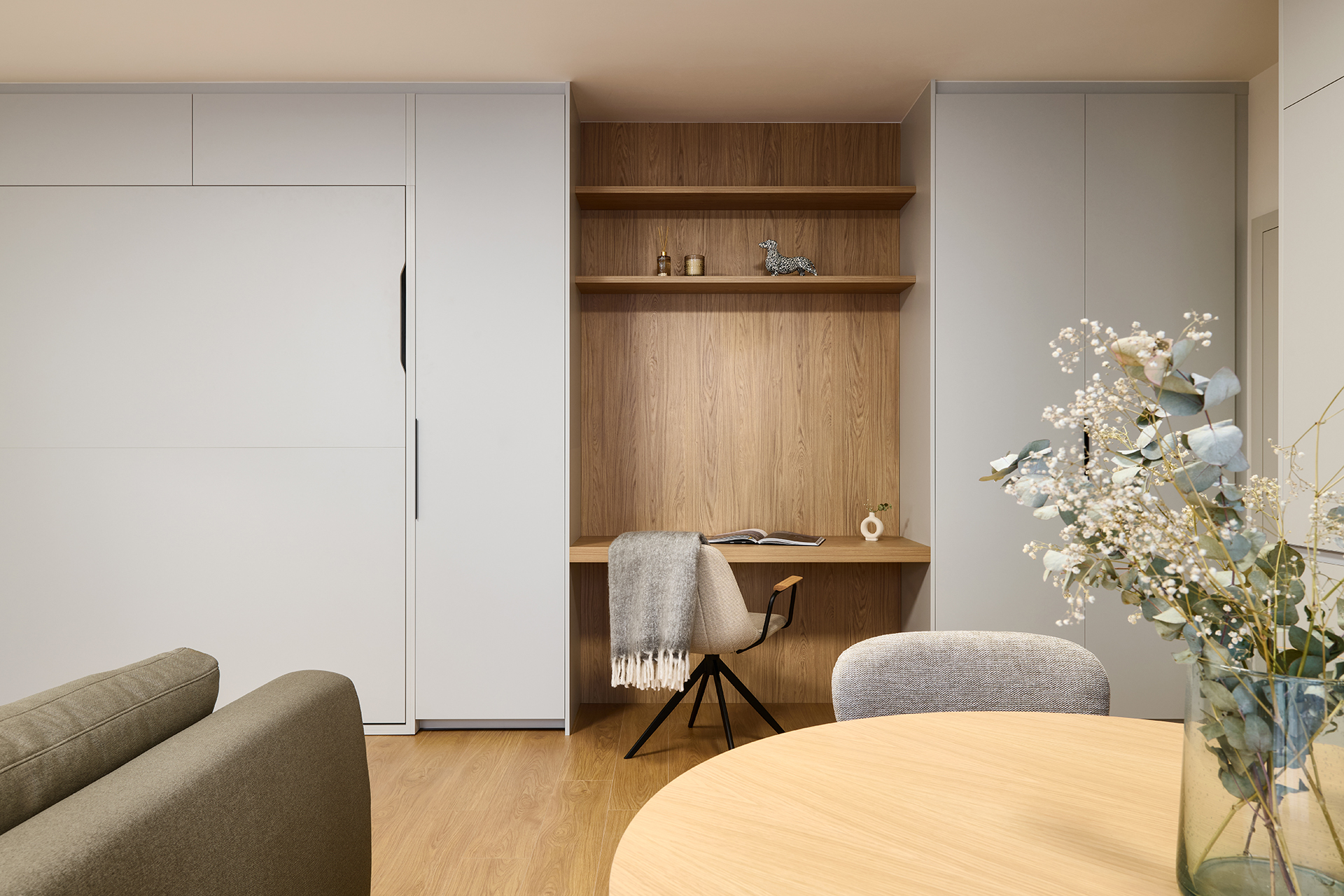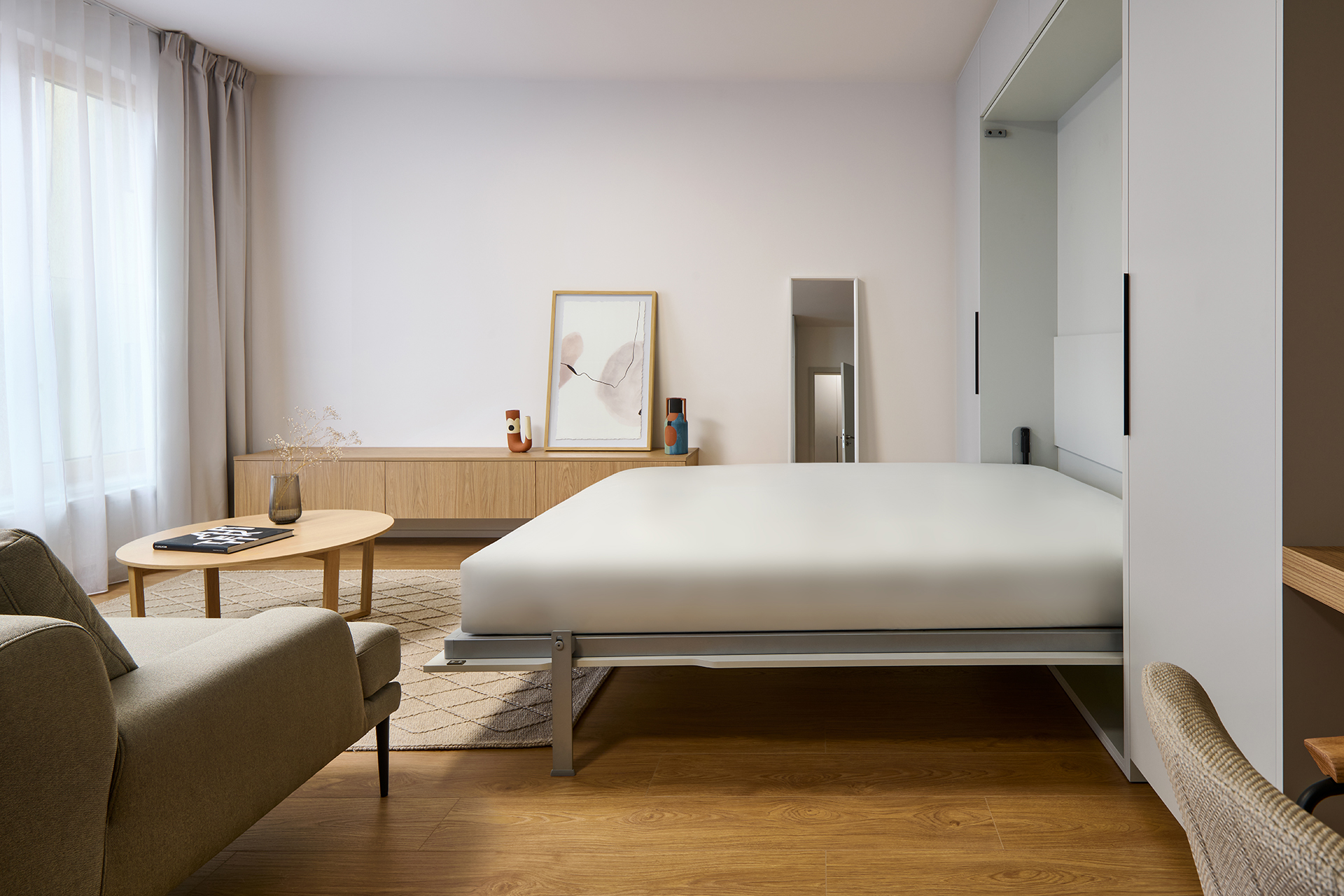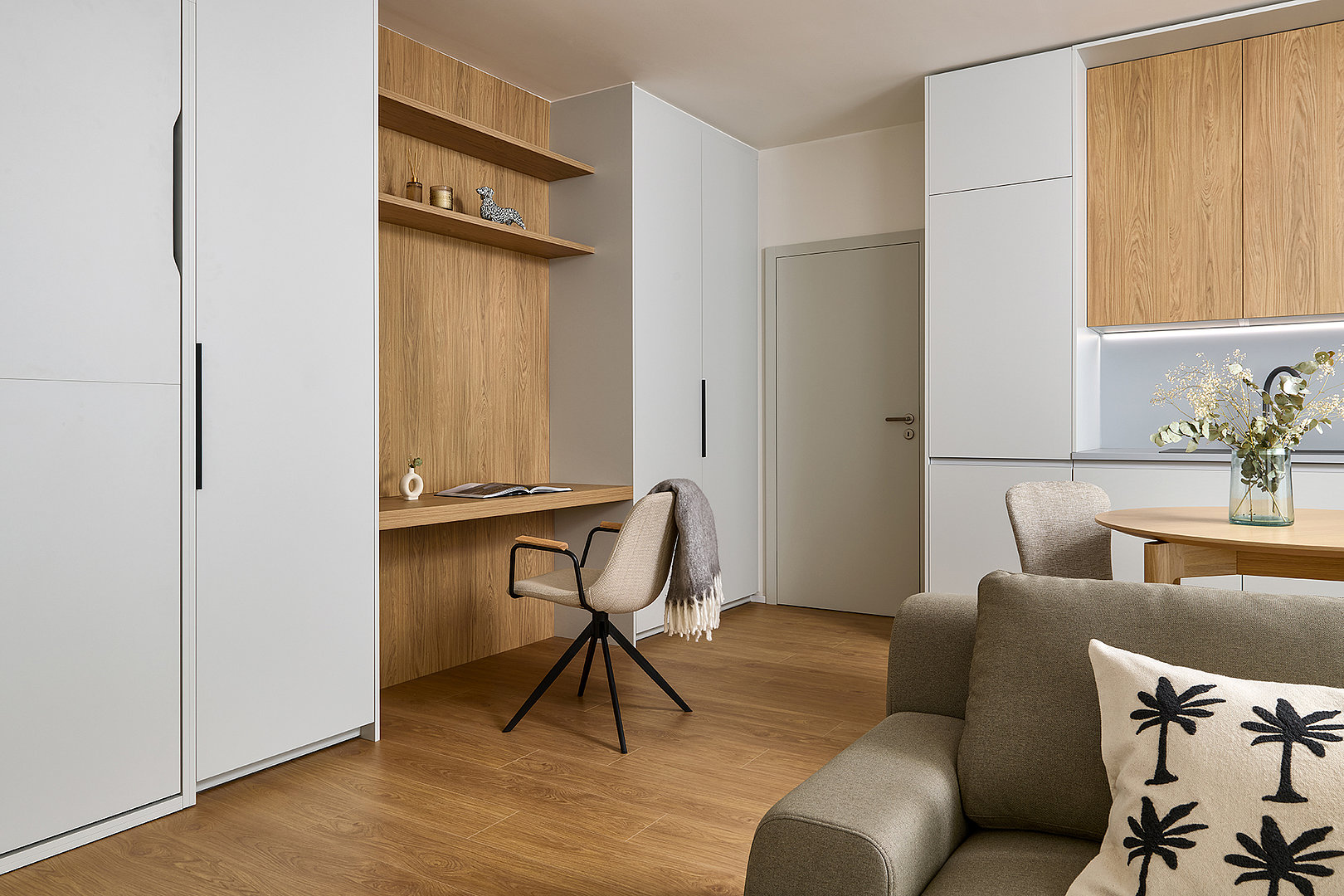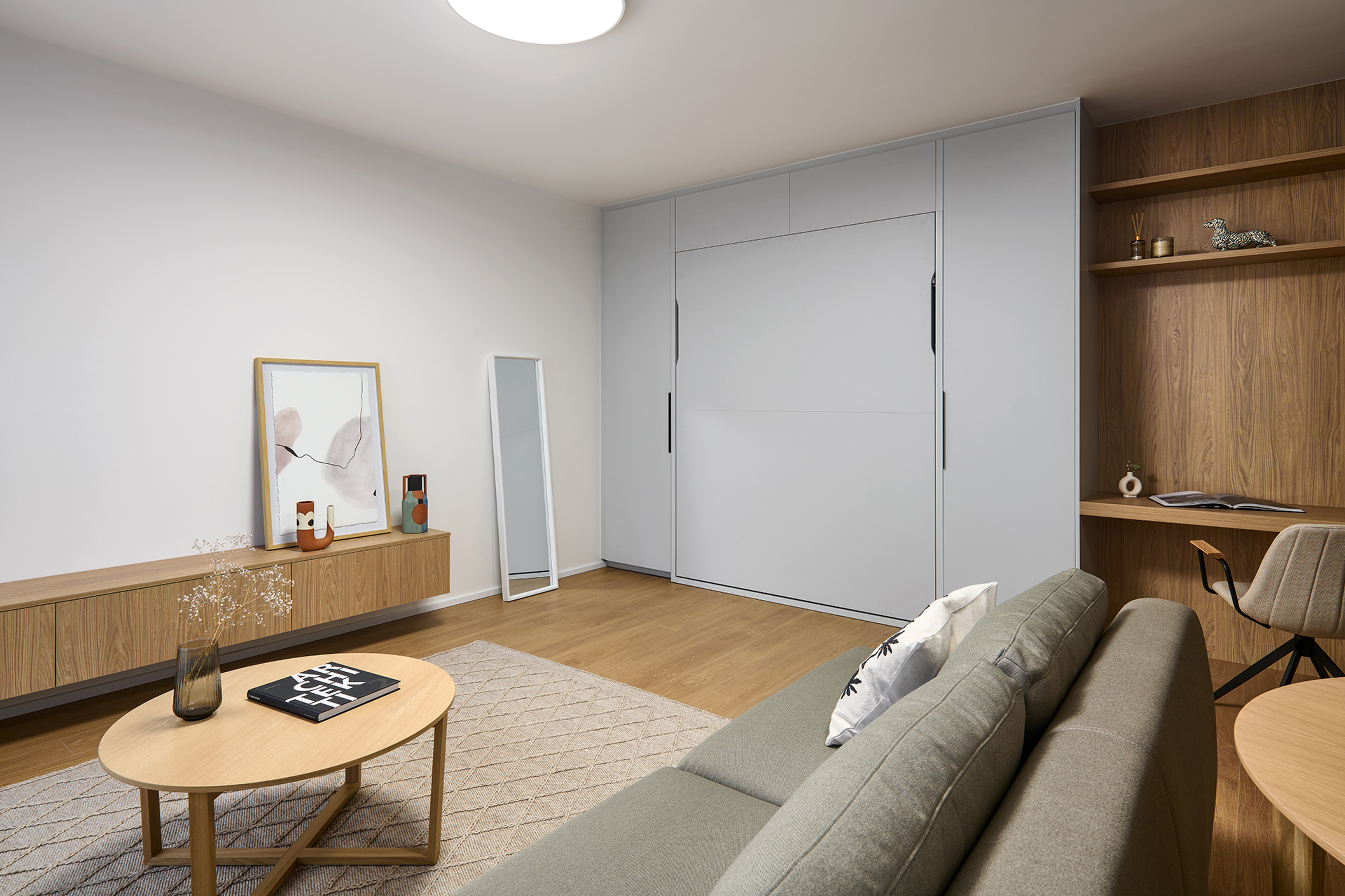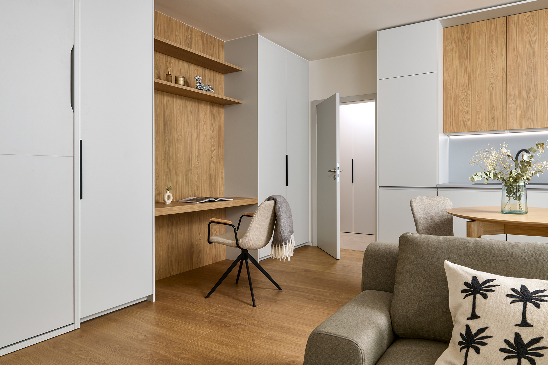 The key feature of the concept is the FLIP fold-down bed, which brings lightness and freedom of movement to the interior. Thanks to this solution, the space remains open and airy without compromising on comfort. During the day, the apartment fully supports everyday living, while in the evening it subtly transforms into a peaceful place for rest. The bed is seamlessly integrated into the furniture composition, maintaining the clean lines of the interior.