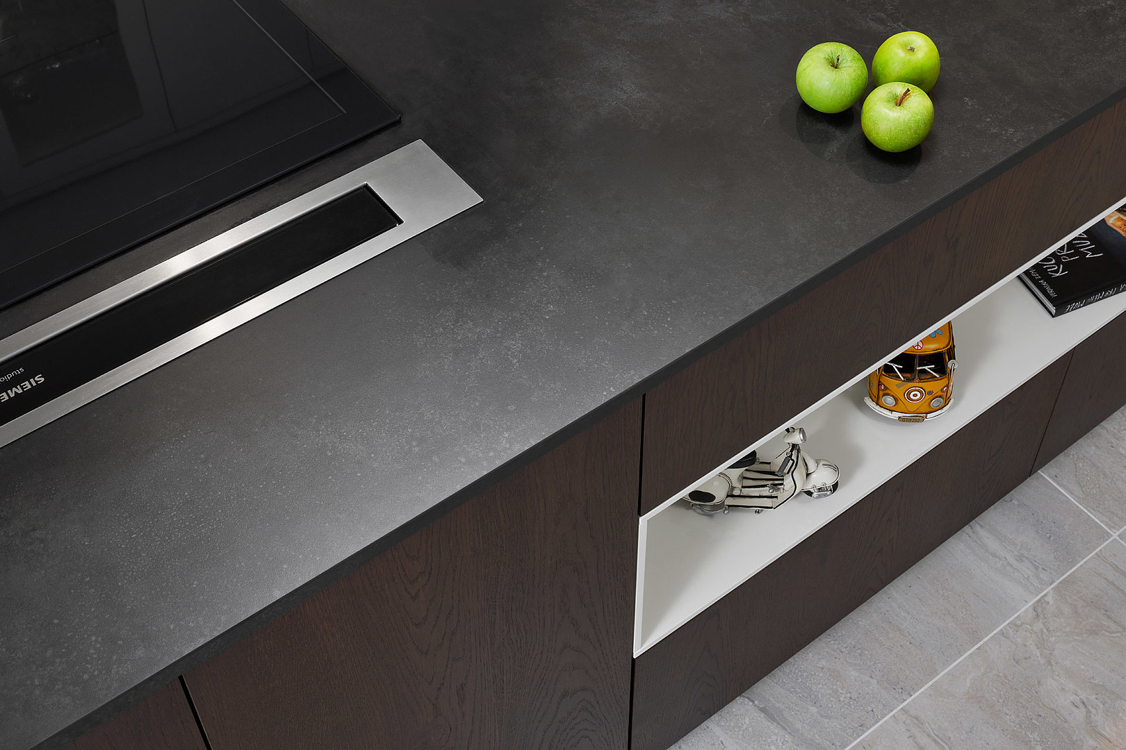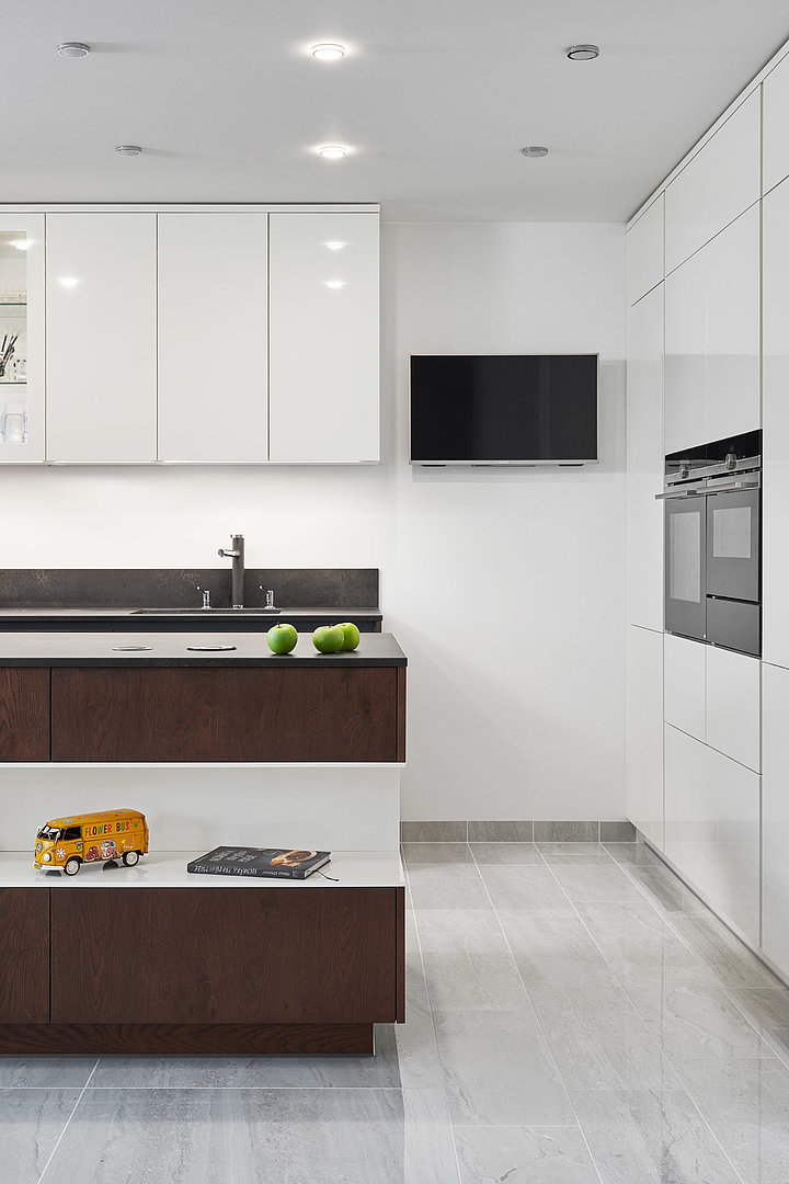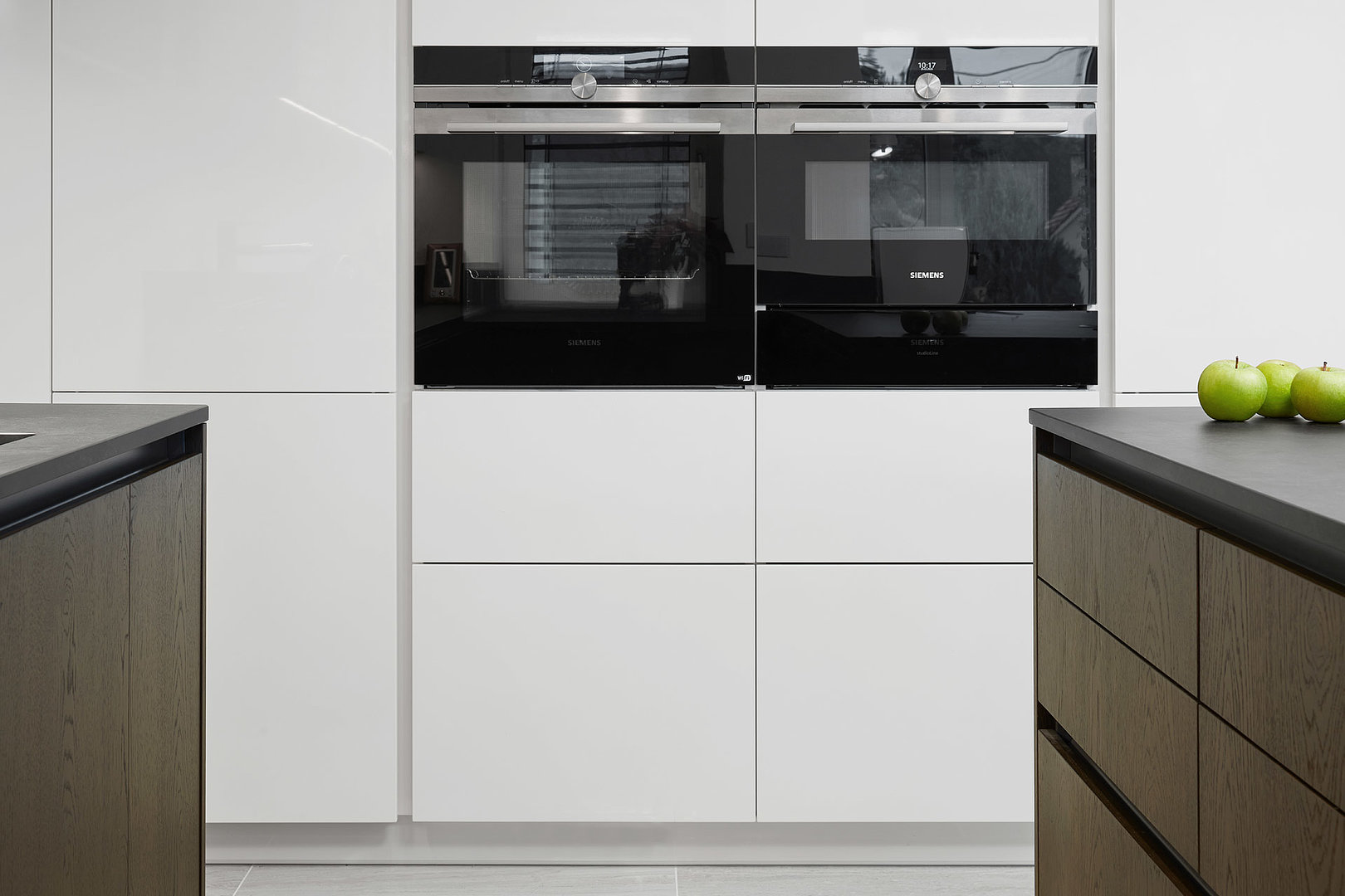 Kuchyně ELITE / LINE - lak bílá orion lesk, dýha dub rustikal hnědý