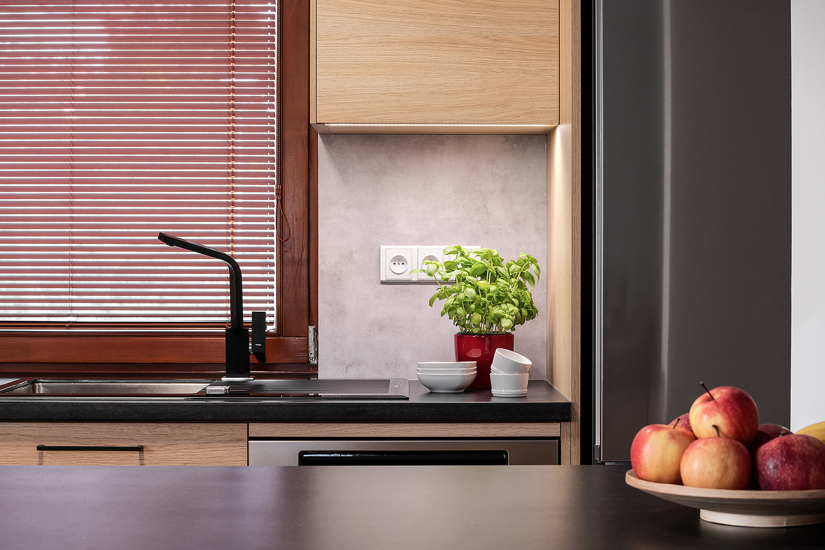 A kitchen in nagano oak with a hint of country style, which matches its name. The solution included atypical design and practical use for the owner.