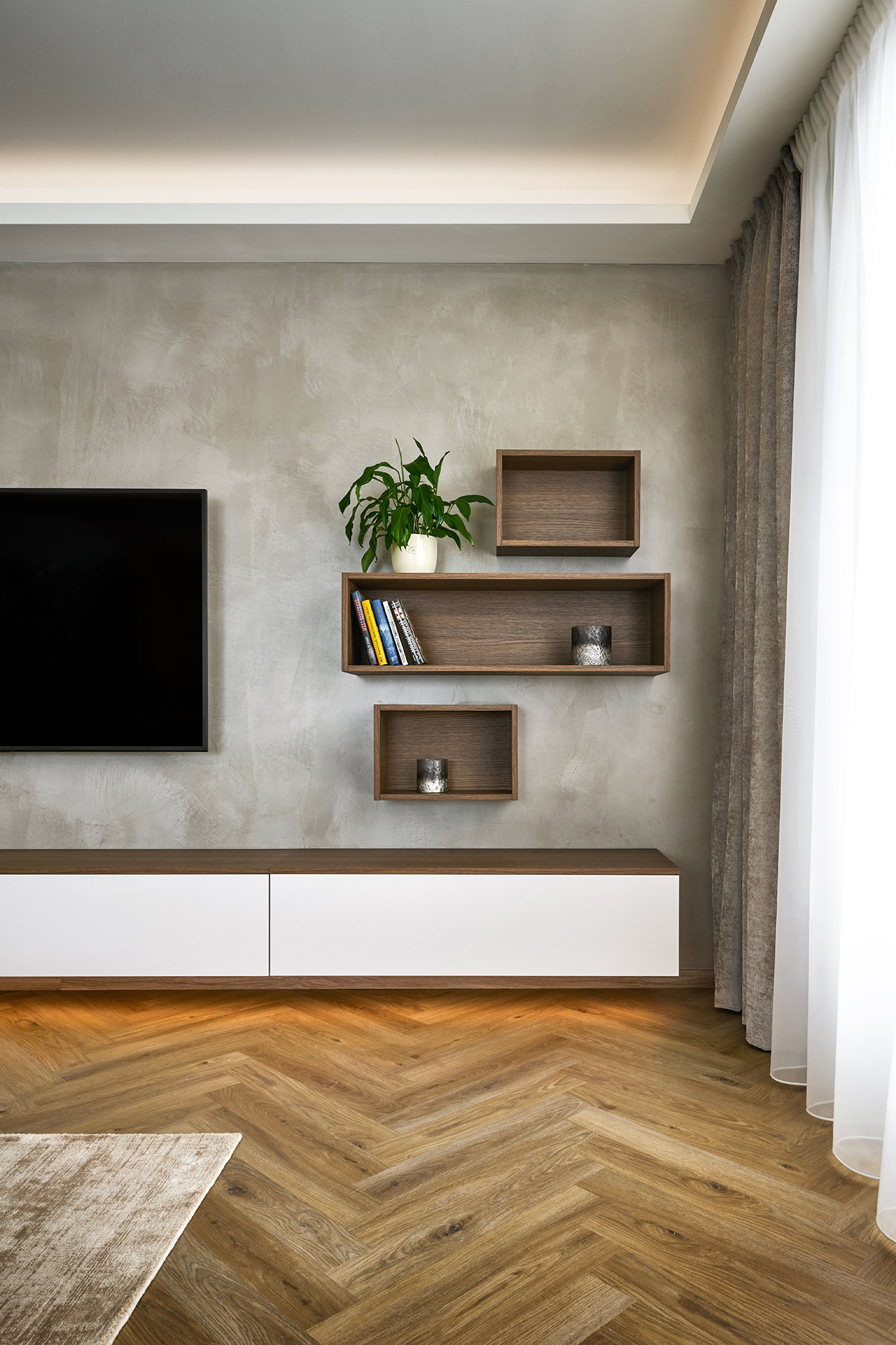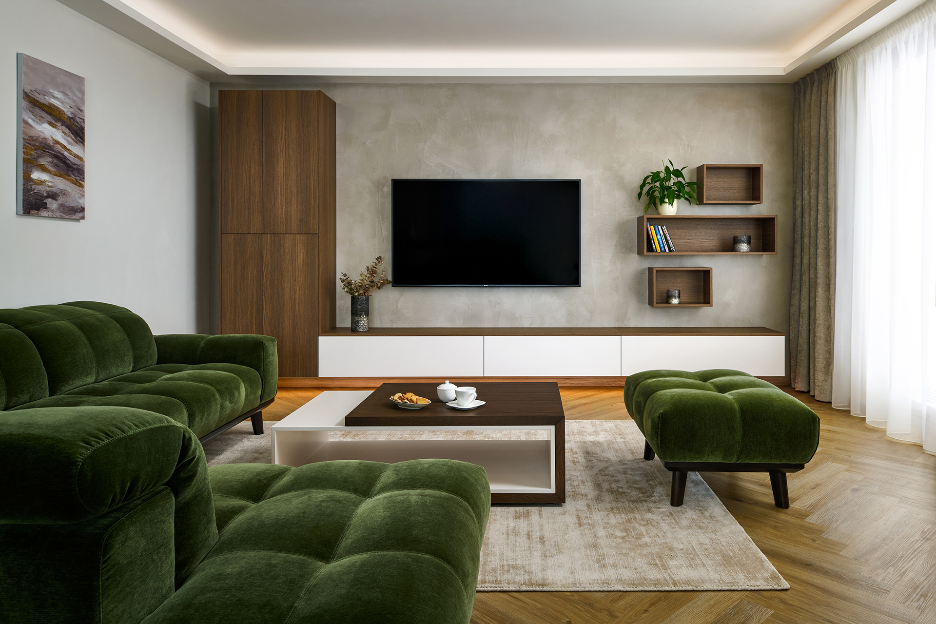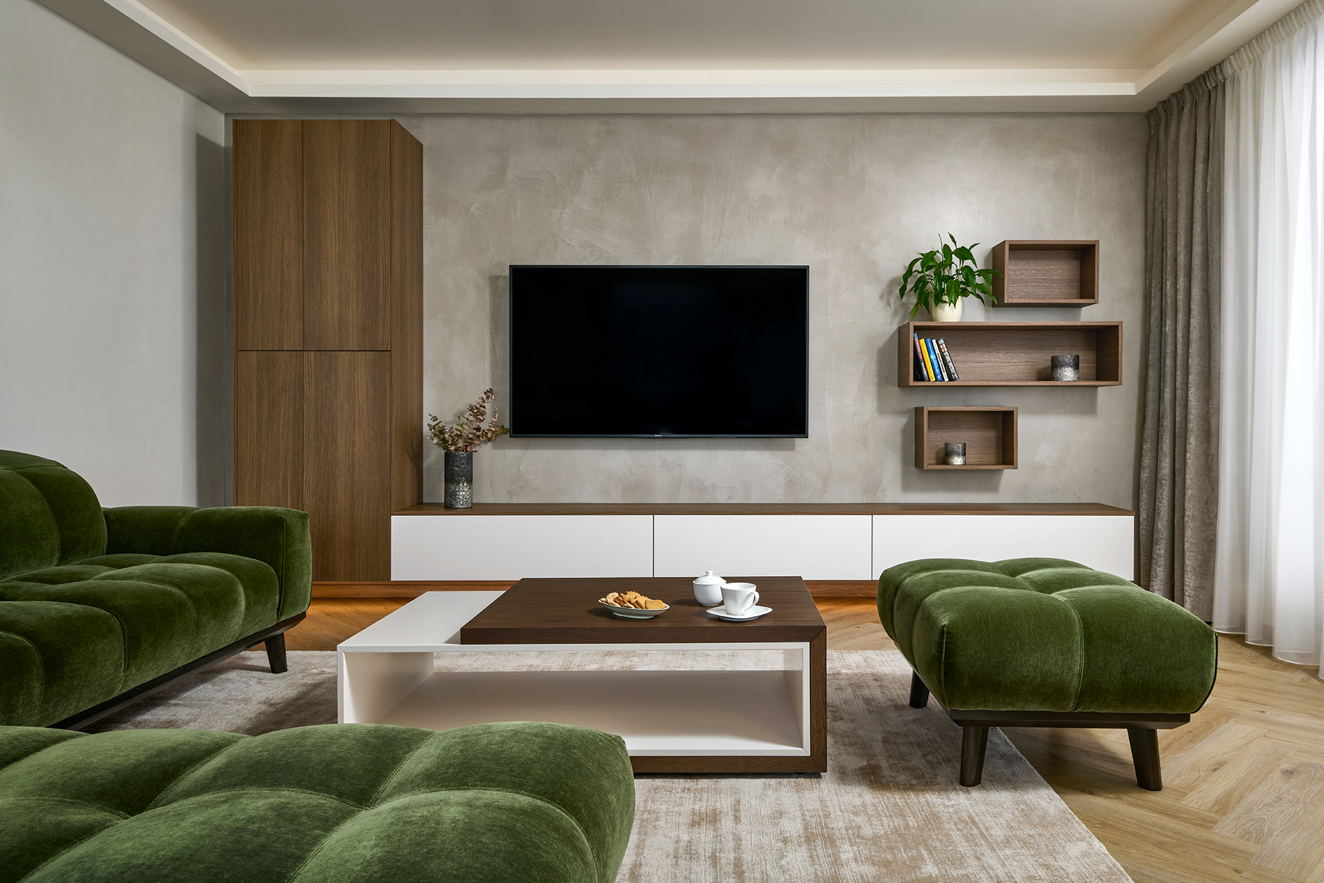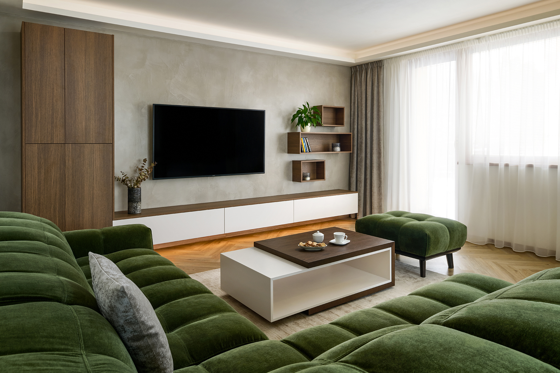 The living area is complemented by a KS43 coffee table and a TV wall combining wood with a matte finish, which matches the overall look of the interior and creates a pleasant atmosphere. Every element, from furniture to decorations, has been carefully chosen to give the space a balanced and timeless feel.