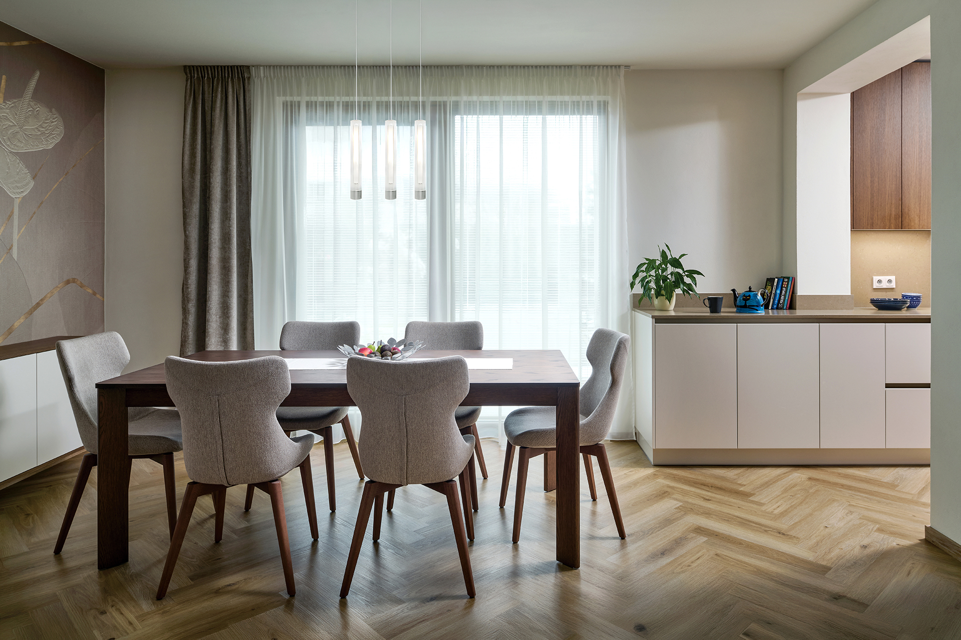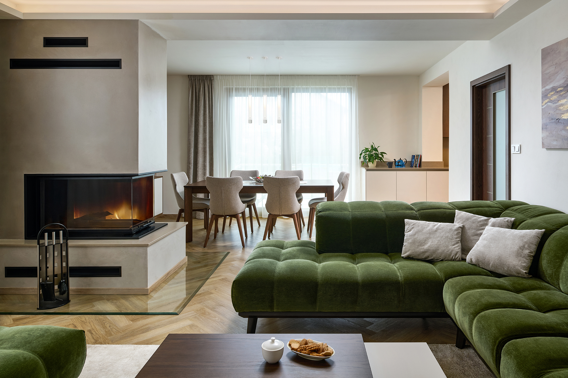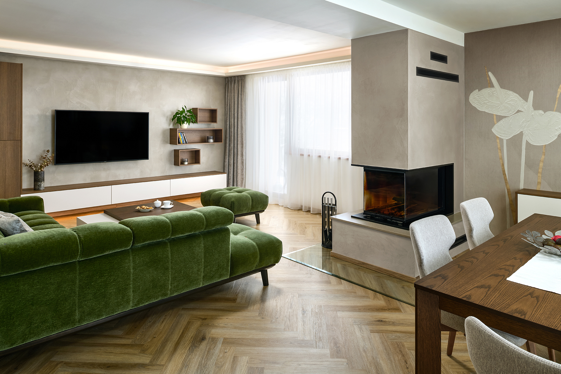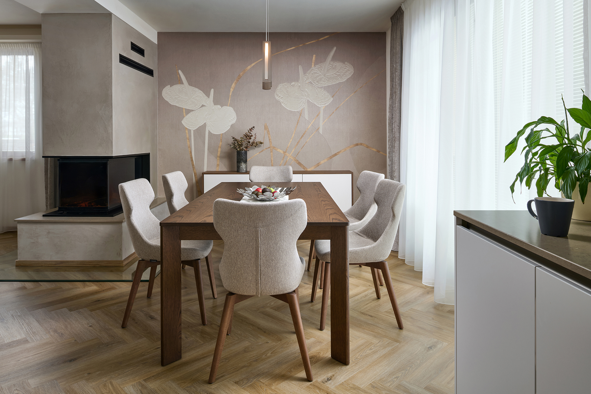 The kitchen flows seamlessly into the dining area with a solid JS32 table and comfortable MAXI chairs in a sandy shade, providing a pleasant place for everyday and more festive moments. Glamora Tamara decorative wallpaper, delicate plasterwork, and fireplace cladding made of the same material as the worktop connect the individual zones and emphasize the overall harmony of the room.