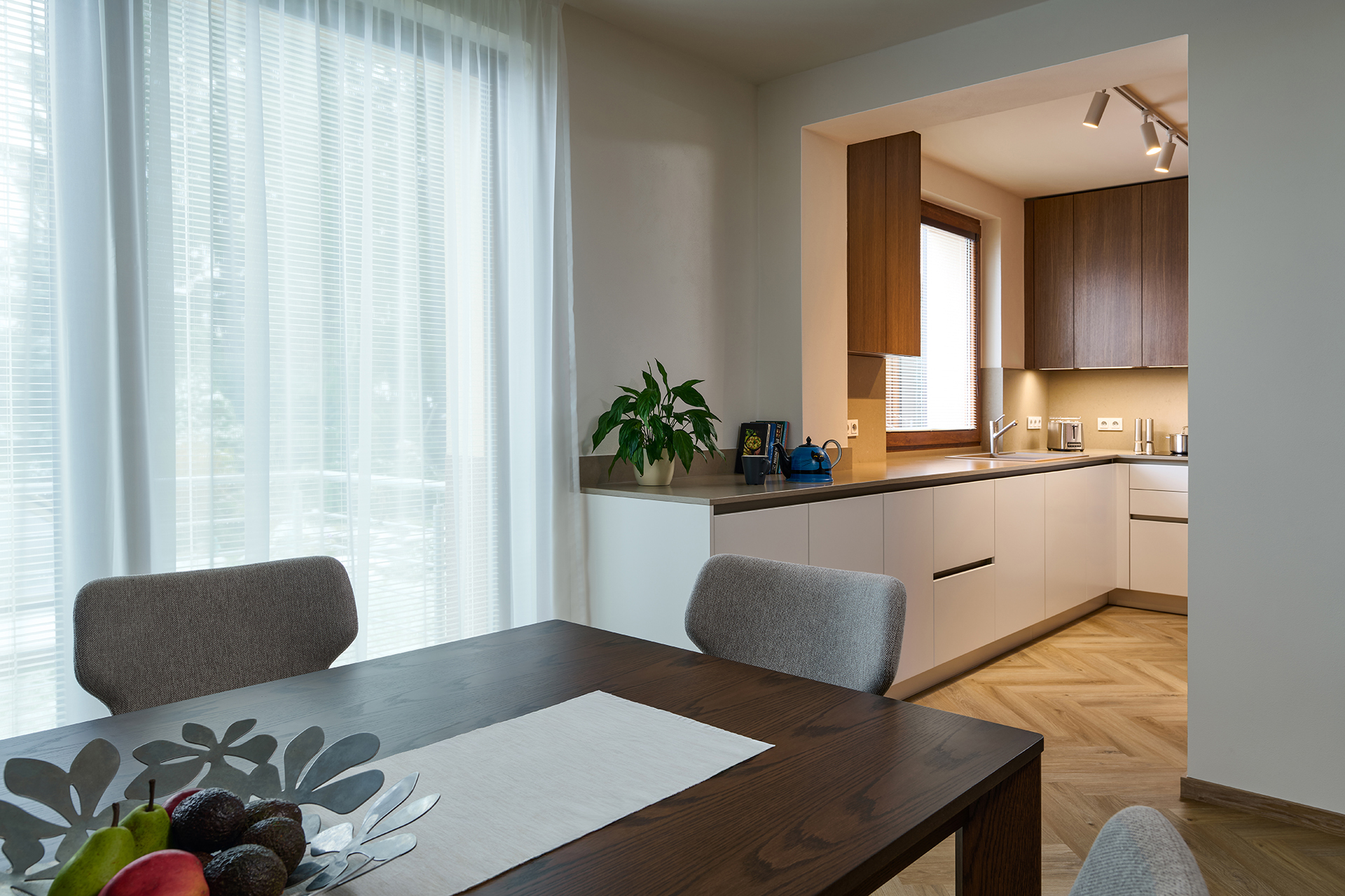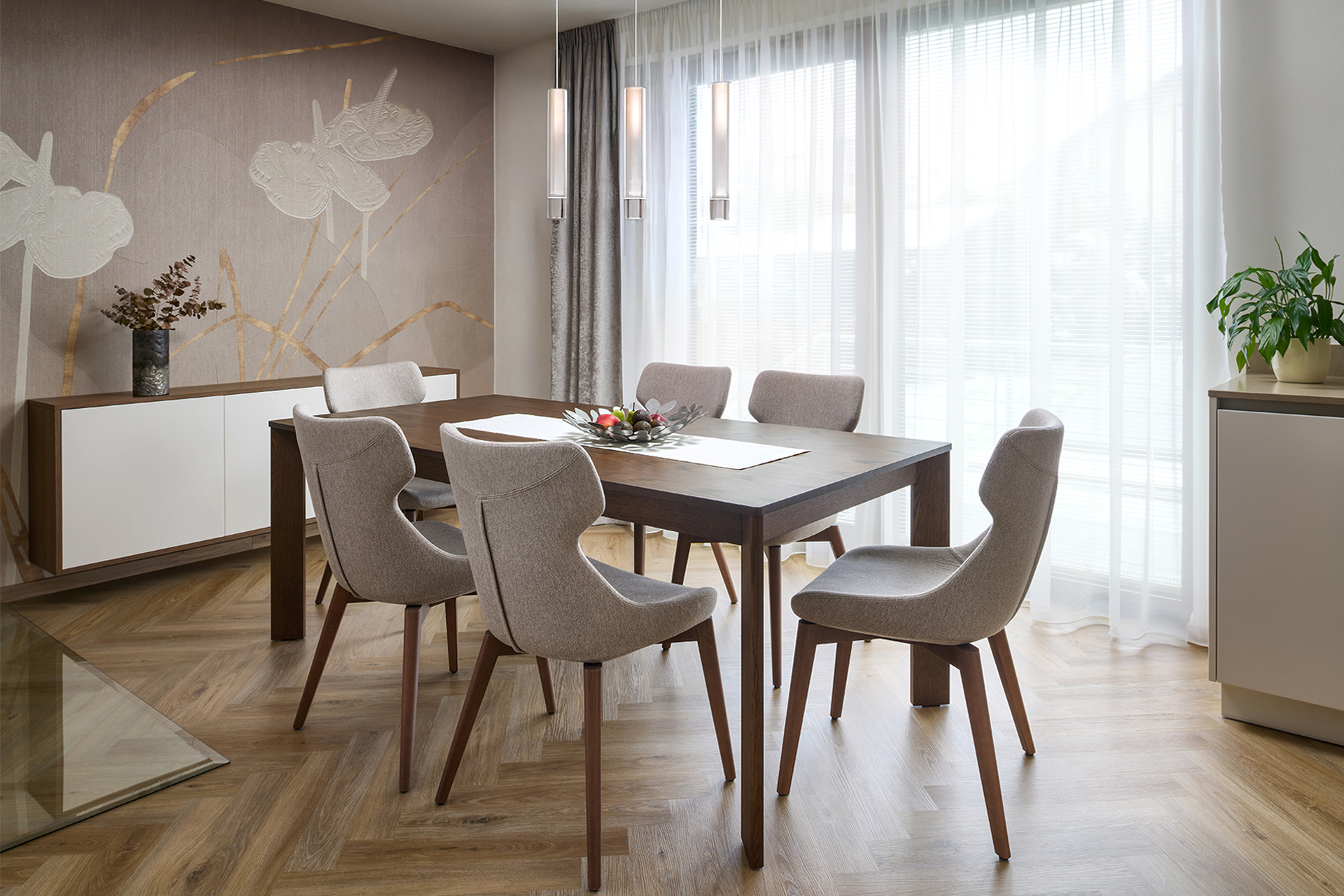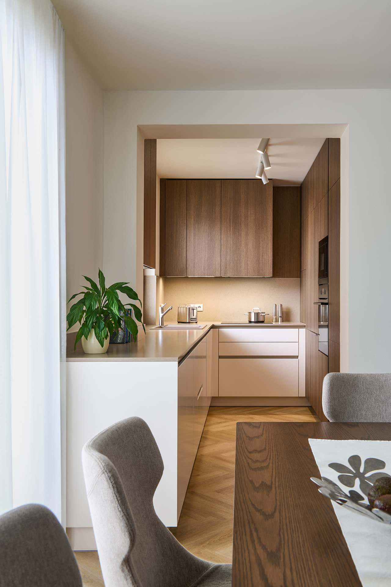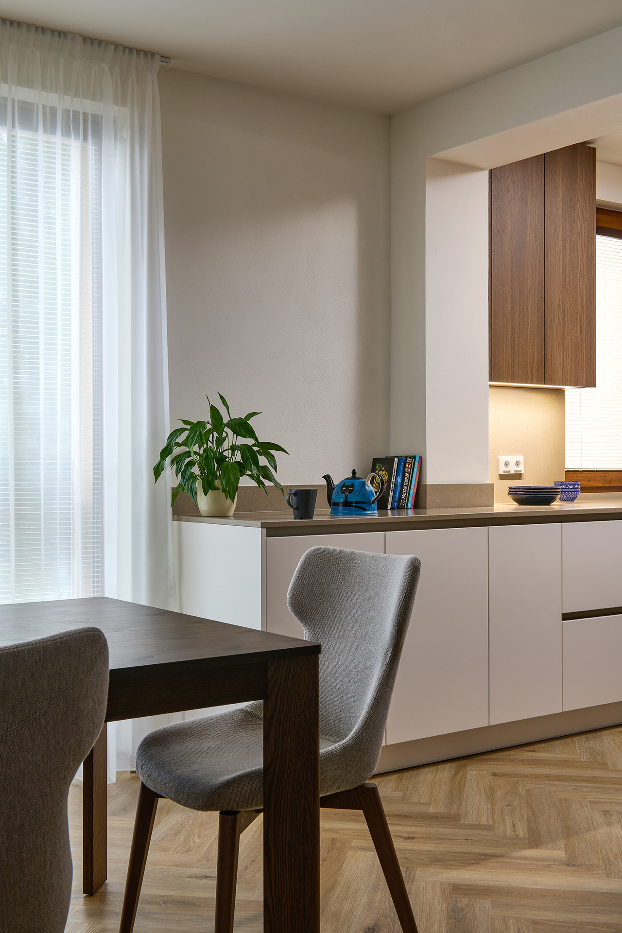The kitchen flows seamlessly into the dining area with a solid JS32 table and comfortable MAXI chairs in a sandy shade, providing a pleasant place for everyday and more festive moments. Glamora Tamara decorative wallpaper, delicate plasterwork, and fireplace cladding made of the same material as the worktop connect the individual zones and emphasize the overall harmony of the room.