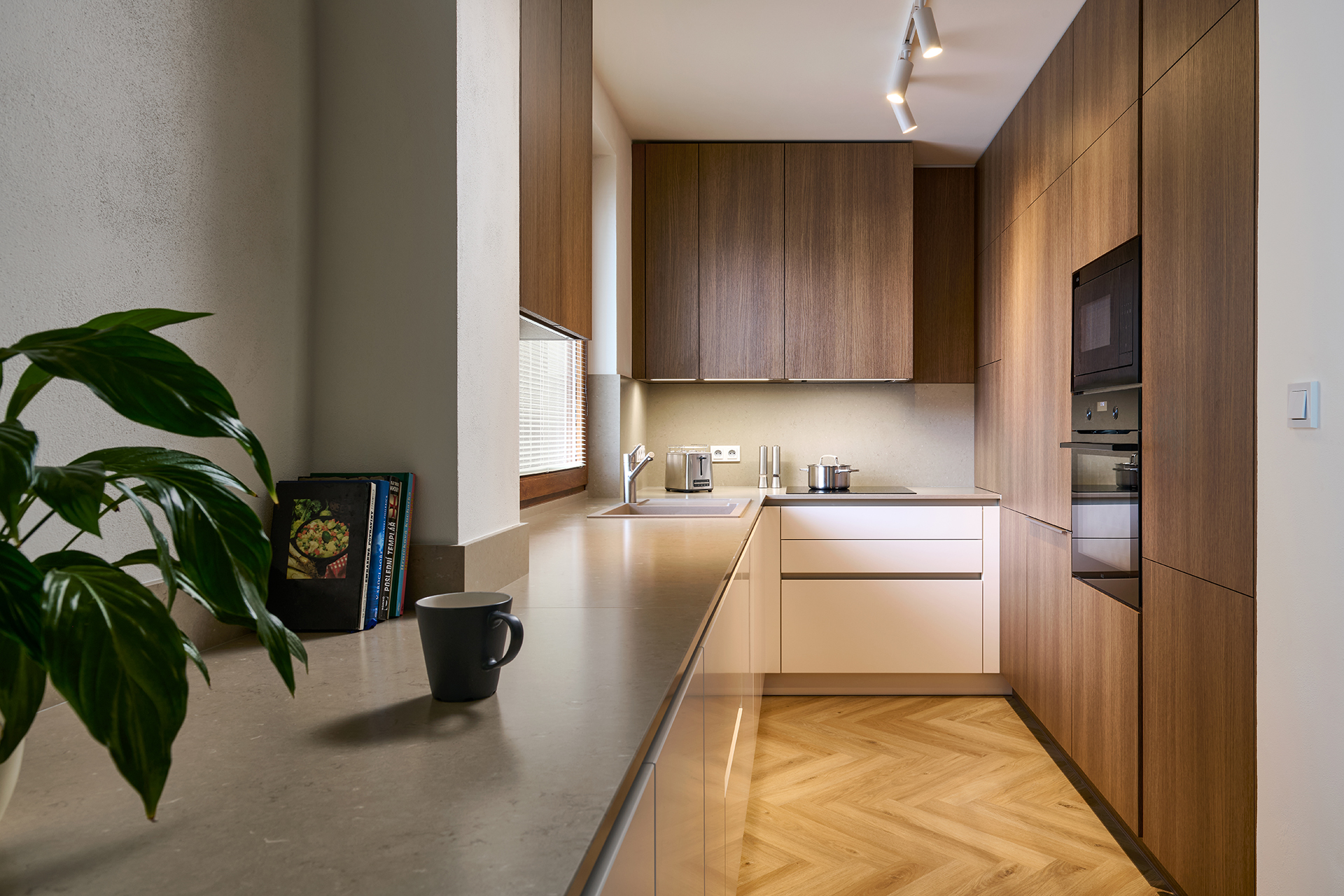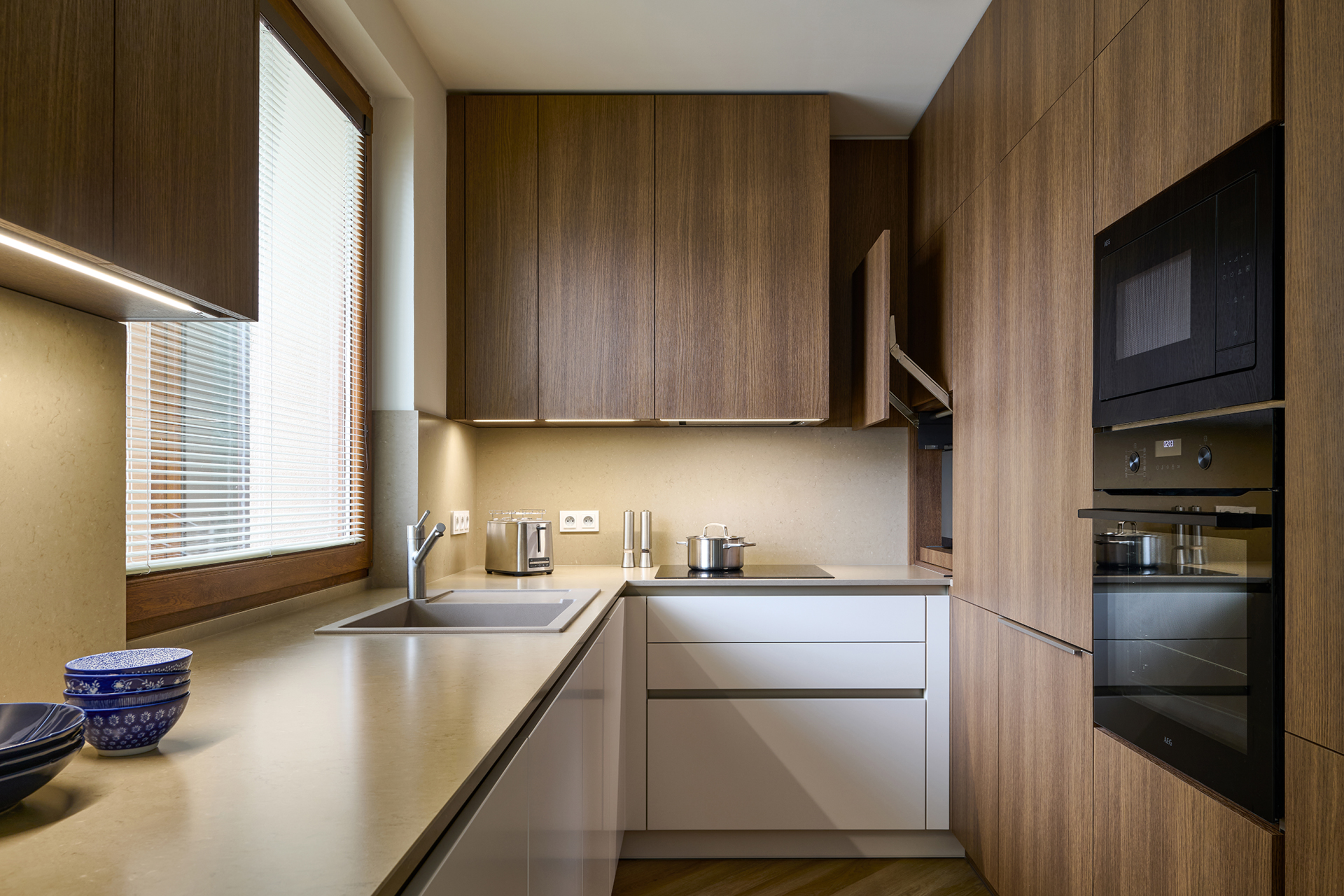 We present an interior with a thoughtful harmony of materials and colors, whose details emphasize a feeling of comfort and elegance. The ELITE kitchen is designed with an emphasis on maximum practicality – the clever arrangement of work surfaces and storage spaces creates a balanced and visually clean whole. The matte White Antique lacquer blends with the warm tones of the Exclusive Oak Brown wood decor, while the matte Silestone Coral Clay worktop with a suede finish adds softness and a touch of luxury.