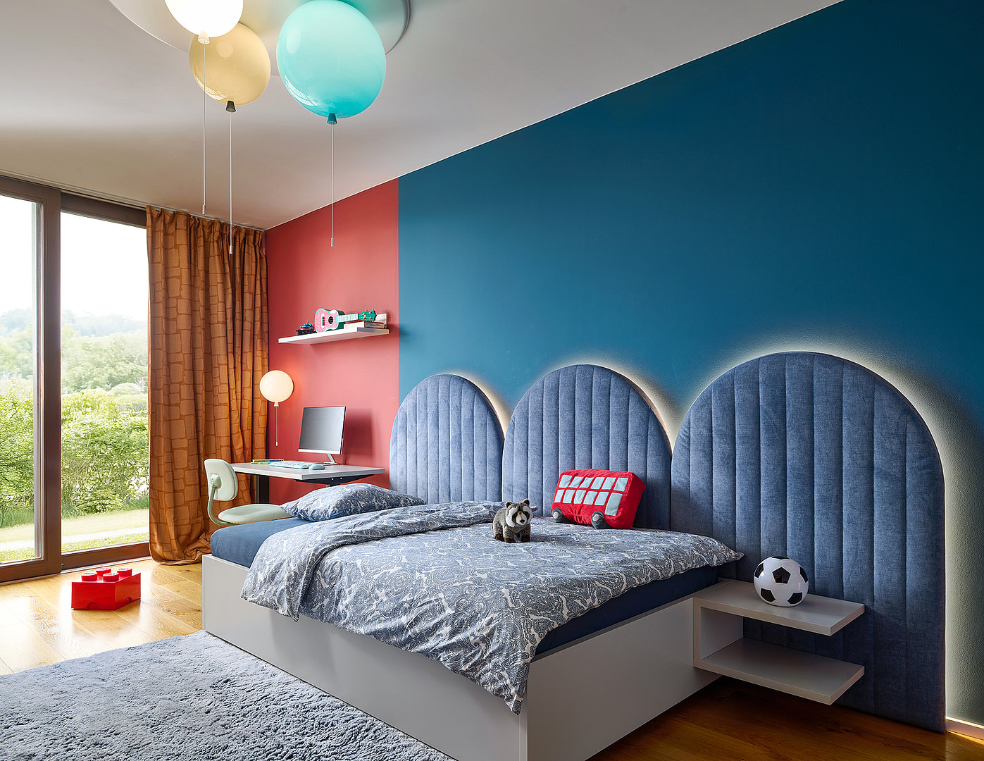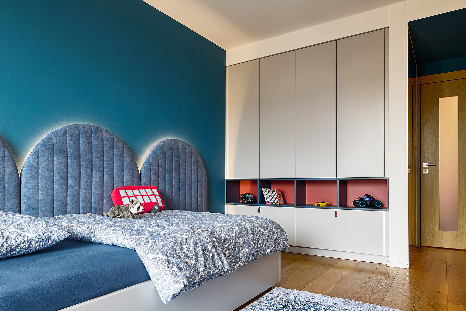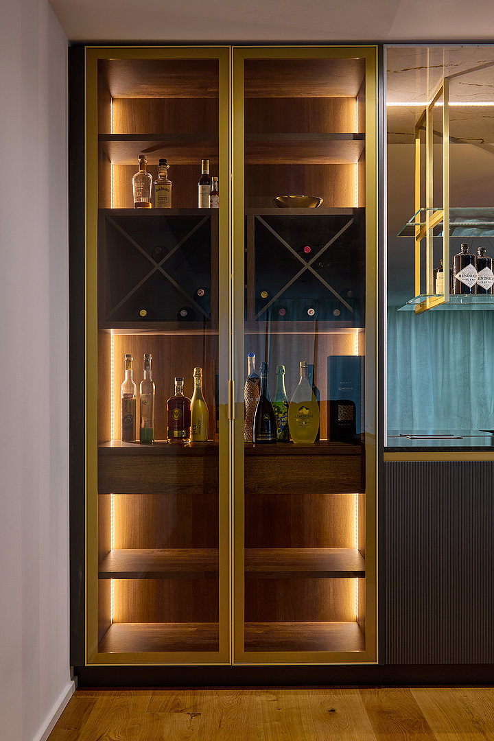 The lounge room is dominated by the ELITE/WAVE kitchen suite in Titan Mat, complete with smoked glass in a gold frame and a worktop in black Nero Zimbabwe granite. Silestone stone with a gold vein and a metal structure with glass shelves add luxurious accents. In the living room, we created a TV wall combining American brown oak veneer, metallic gold elements and acoustic panels. The overall impression is accentuated by thin ceramics in imitation green marble. The children's room is designed in a combination of OPTIMA style in shades of light grey, steel blue and terracotta. It includes a SALY bed, upholstered tiles and bespoke bookcases, complete with Brokis designer lights. In the hallway, OPTIMA built-in wardrobes in a matt champagne shade with gold handles, upholstery and a gold-framed mirror were used.