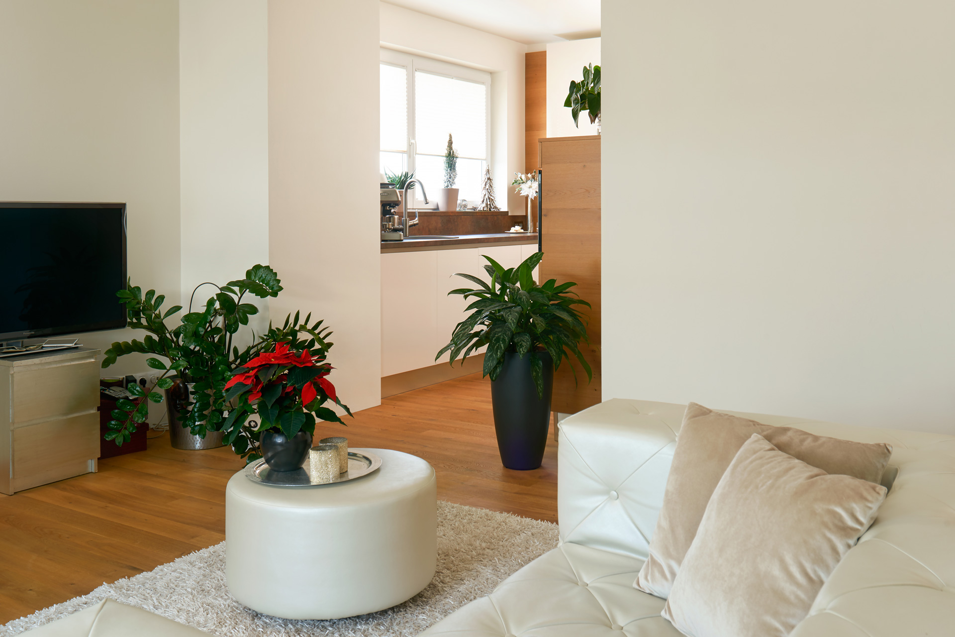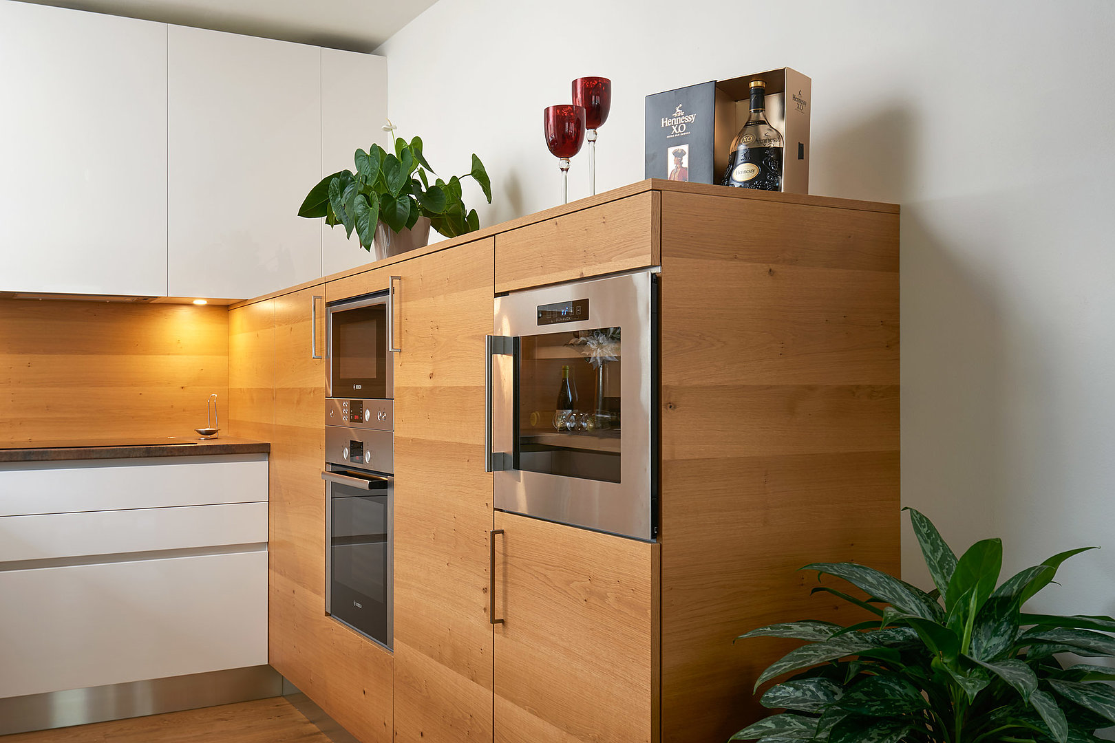Elegantní interiér nového bytu s nejoblíbenějším modelem kuchyně ELITE v bílém laku. Vkusně se zde prolíná bílý odstín s přírodní dýhou.