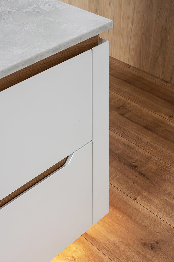 Ukázka kuchyňské sestavy modelu SOLID/LINE v nadčasovém bílém laku v matném provedení v kombinaci s přírodní dýhou.