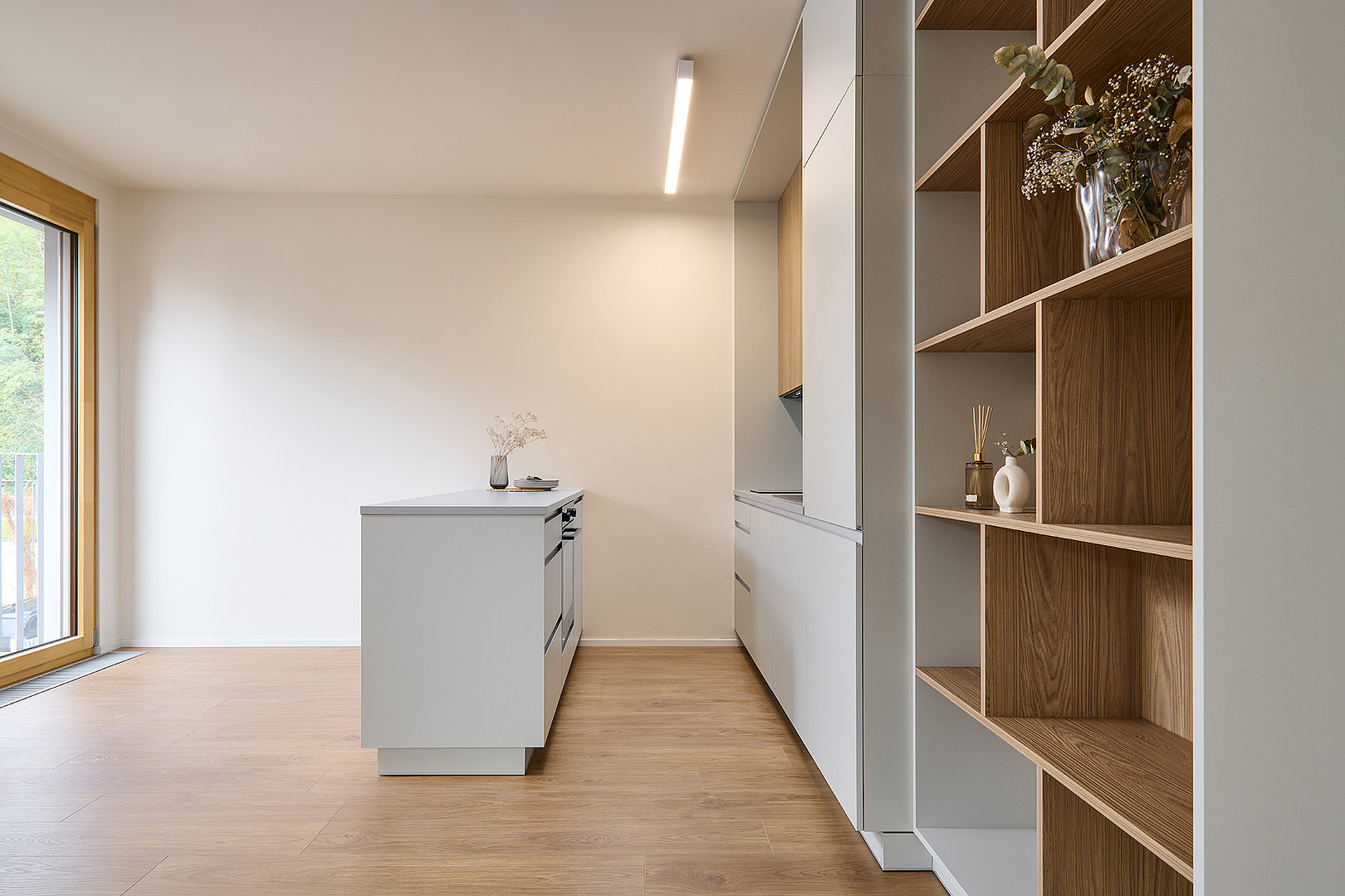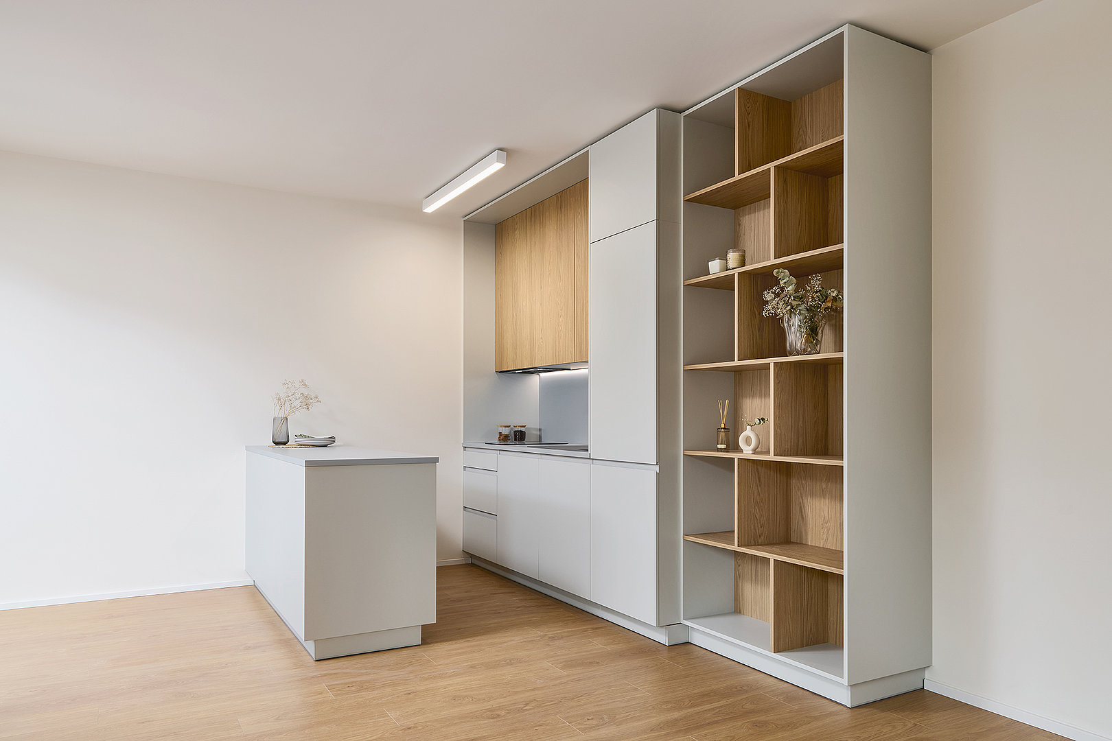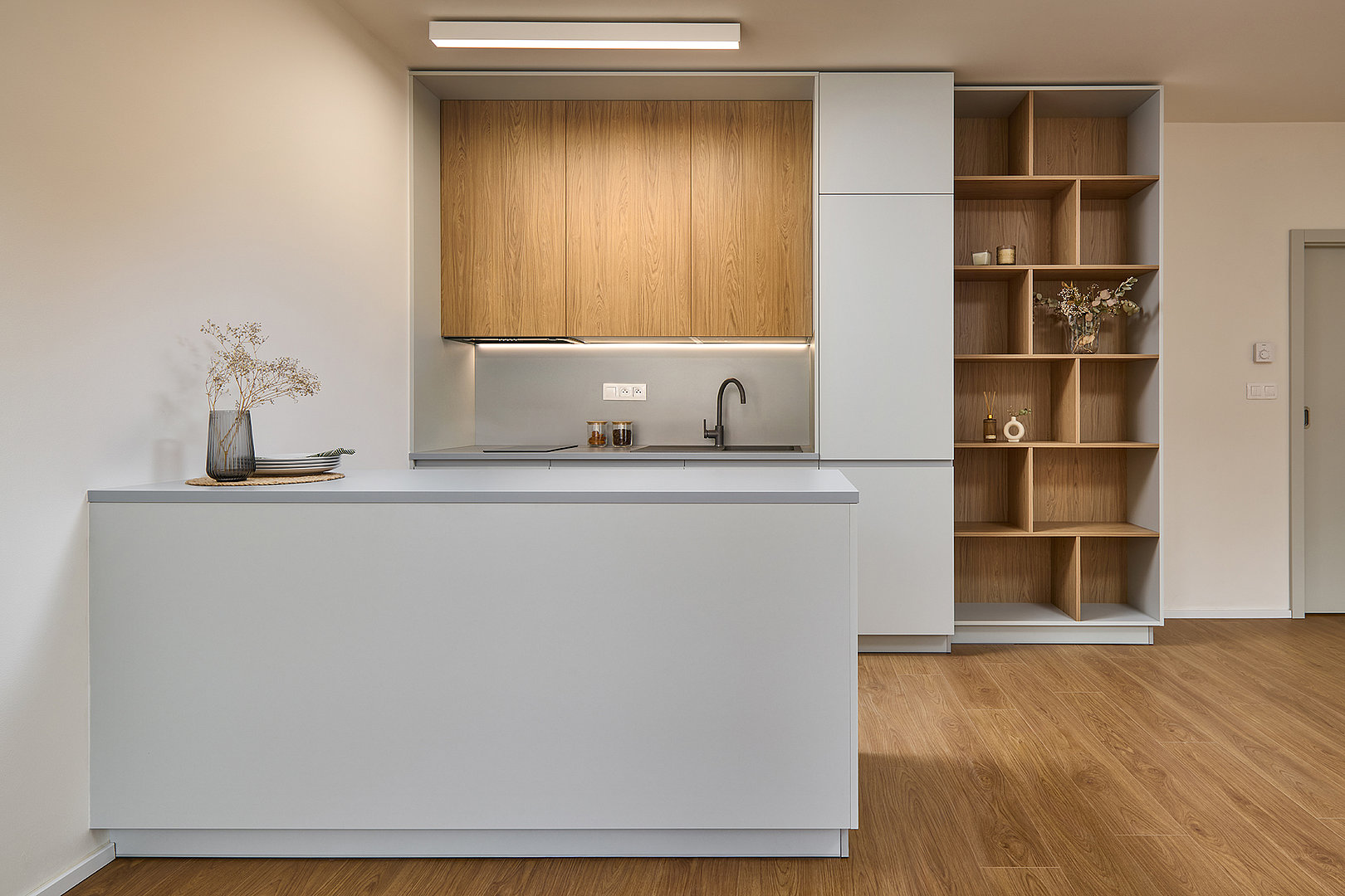 Interiér bytu 2+kk je navržen jako funkční a harmonický celek s důrazem na jednoduchost, přehlednost a dlouhodobou nadčasovost. Kuchyně SIMPLE pracuje s kombinací šedého lamina a dekoru dub quercus sienna, který prostoru dodává přirozené teplo a vizuální klid. Čisté linie a promyšlené uspořádání vytvářejí přirozené propojení kuchyně s obytnou částí bytu.