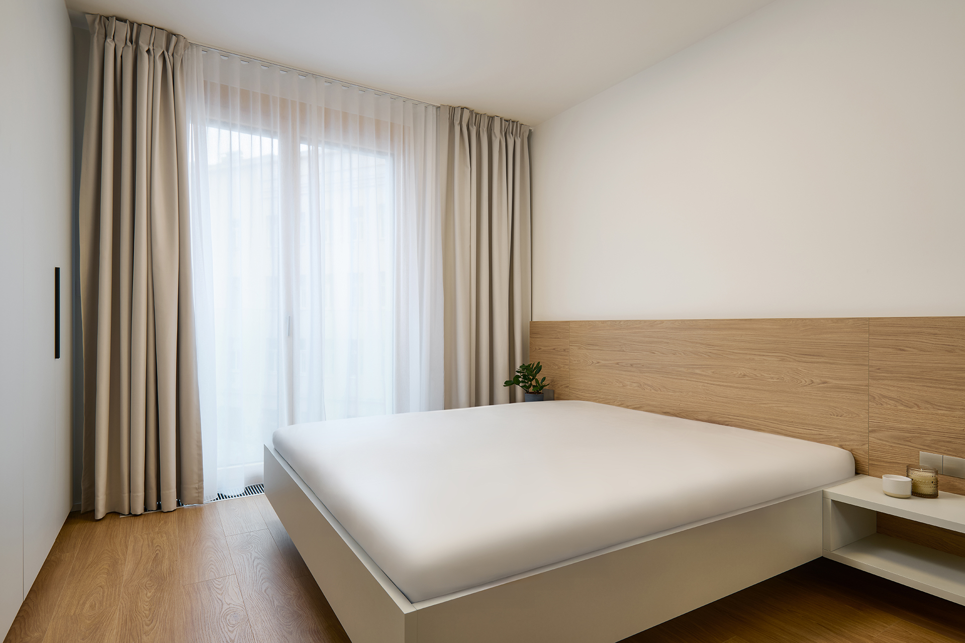 Stejný materiálový koncept se plynule přenáší také do ložnice, kde podporuje pocit jednoty a klidné atmosféry. Minimalistické řešení, tlumená barevnost a dostatek úložných prostor dávají interiéru vyvážený charakter a umožňují jeho snadné doplnění osobitými detaily. Realizace je ukázkou funkčního bydlení, které stojí na kvalitních materiálech, čistém designu a promyšleném detailu.