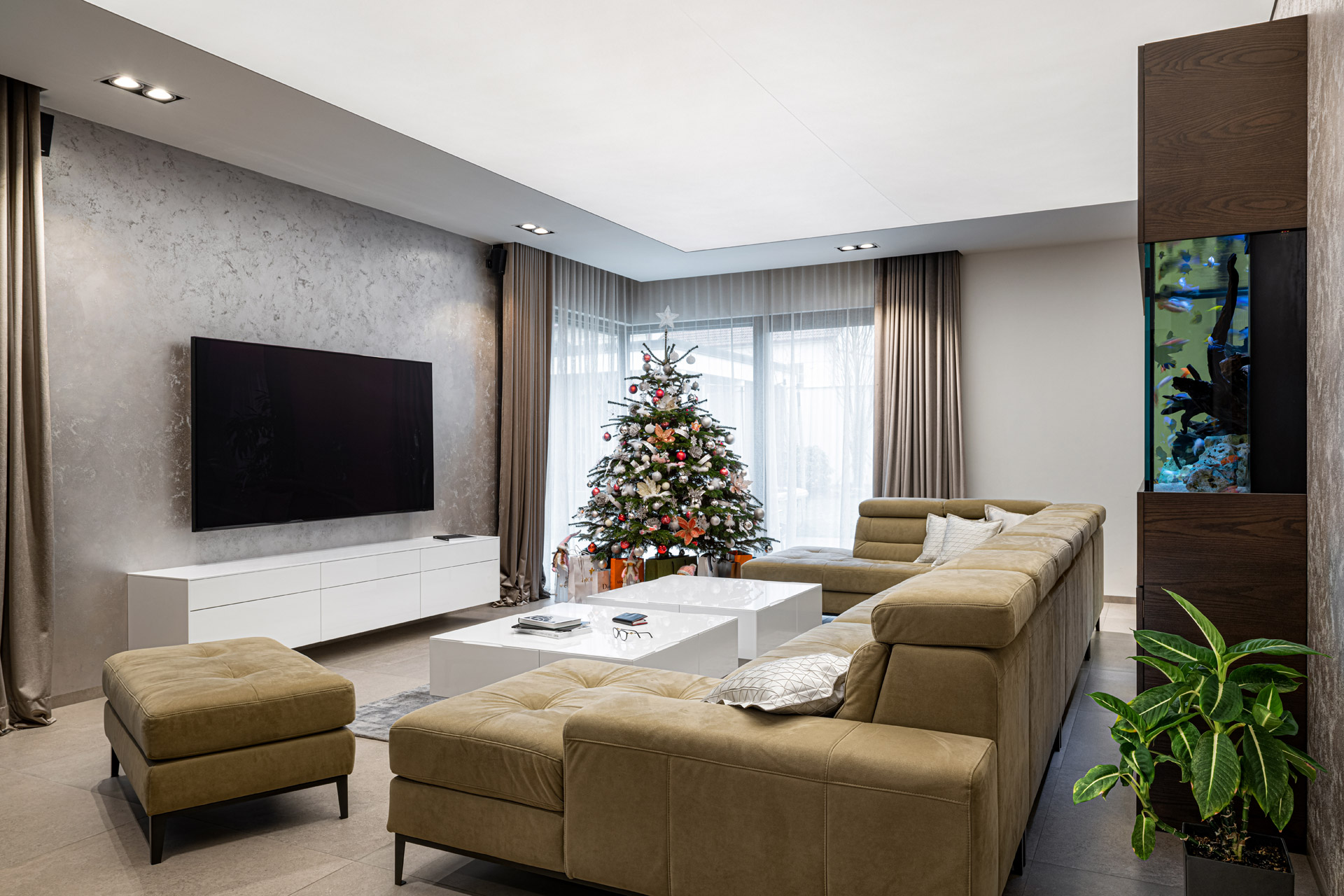Obývací pokoj s akváriem na míru a prostornou sedací soupravou ICON. Akvárium je částečně zabudované v dělící stěně s kuchyní a nabízí tak originální živý obraz ve dvou místnostech zároveň.